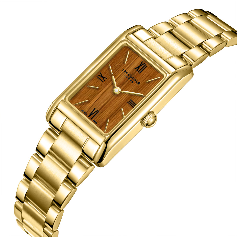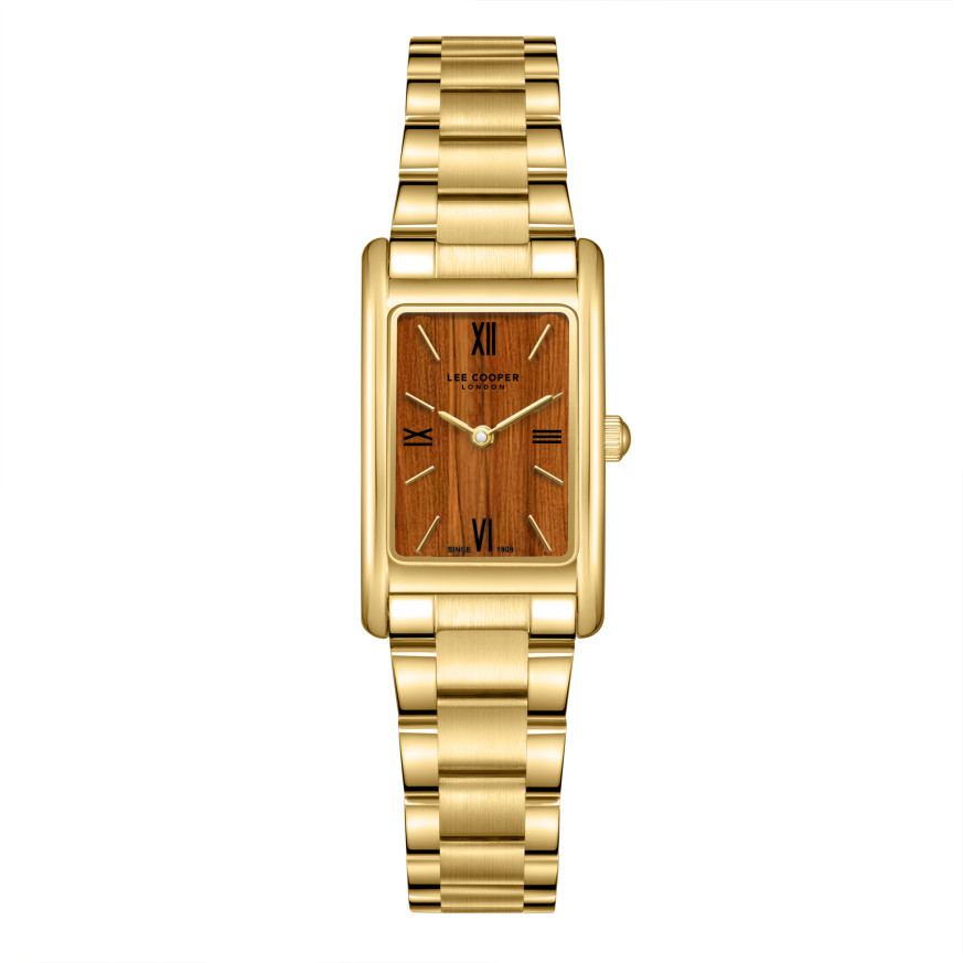 Класически модел дамски часовник Lee Cooper от колекцията Elegance. Правоъгълен корпус изработен от супер метал (специална сплав, създадена от Lee Cooper). Верижка от неръждаема стомана. Аналогов дисплей в кафяв цвят. Стъкло минерал-кристал. Часовникът се задвижва от кварцов механизъм. Водоустойчивост 3 ATM - допускат се леки пръски, не се препоръчва обилно мокрене.