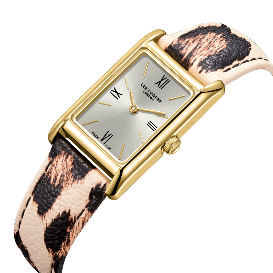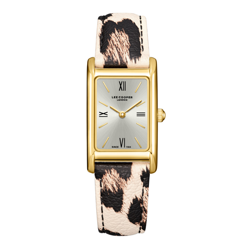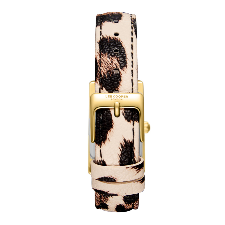 Класически модел дамски часовник Lee Cooper от колекцията Elegance. Правоъгълен корпус изработен от супер метал (специална сплав, създадена от Lee Cooper). Каишка от естествена кожа с интересен принт. Аналогов дисплей в сребрист цвят. Стъкло минерал-кристал. Часовникът се задвижва от кварцов механизъм. Водоустойчивост 3 ATM - допускат се леки пръски, не се препоръчва обилно мокрене.