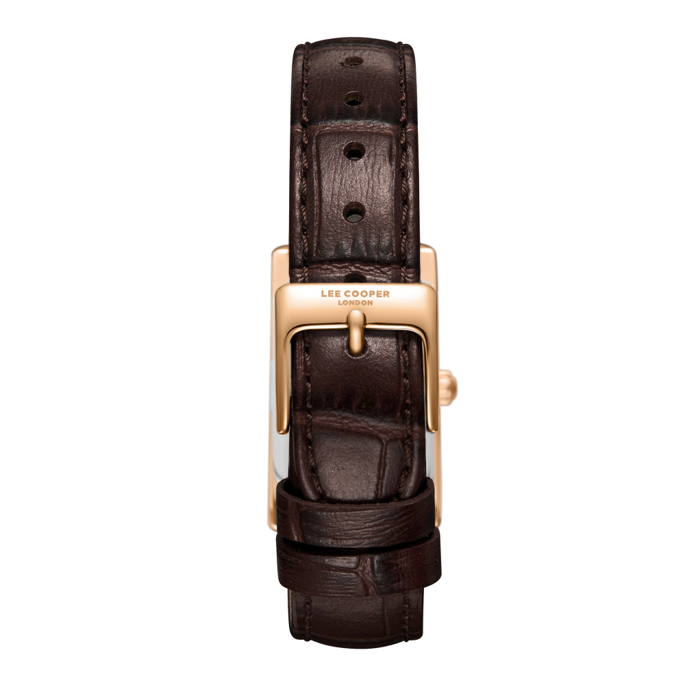 Класически модел дамски часовник Lee Cooper от колекцията Elegance. Правоъгълен корпус изработен от супер метал (специална сплав, създадена от Lee Cooper). Кафява каишка от естествена кожа. Аналогов дисплей в интересен сиво-бежов цвят. Стъкло минерал-кристал. Часовникът се задвижва от кварцов механизъм. Водоустойчивост 3 ATM - допускат се леки пръски, не се препоръчва обилно мокрене.