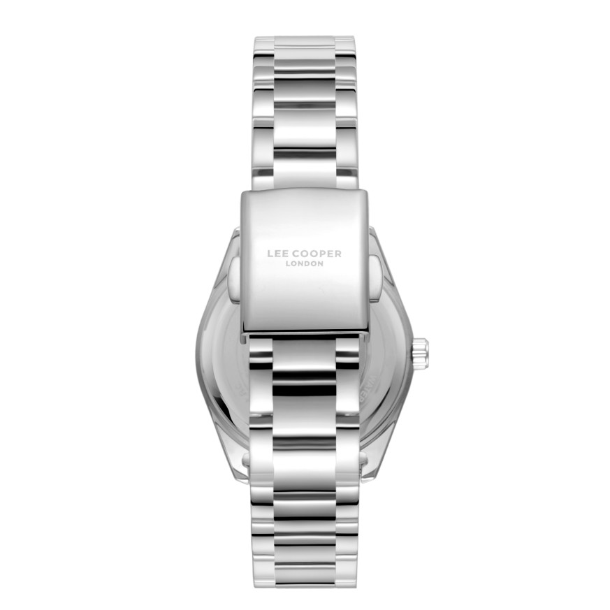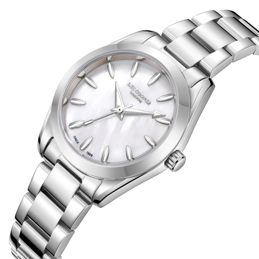 Дамски часовник Lee Cooper с класическа визия от колекцията Elegance. Моделът е с корпус изработен от супер метал (специална сплав, създадена от Lee Cooper) и верижка от неръждаема стомана. Аналогов дисплей в нежен седефен цвят. Диаметър на корпуса 32 мм. Стъкло минерал-кристал. Часовникът се задвижва от кварцов механизъм. Водоустойчивост 3 ATM - допускат се леки пръски, не се препоръчва обилно мокрене.