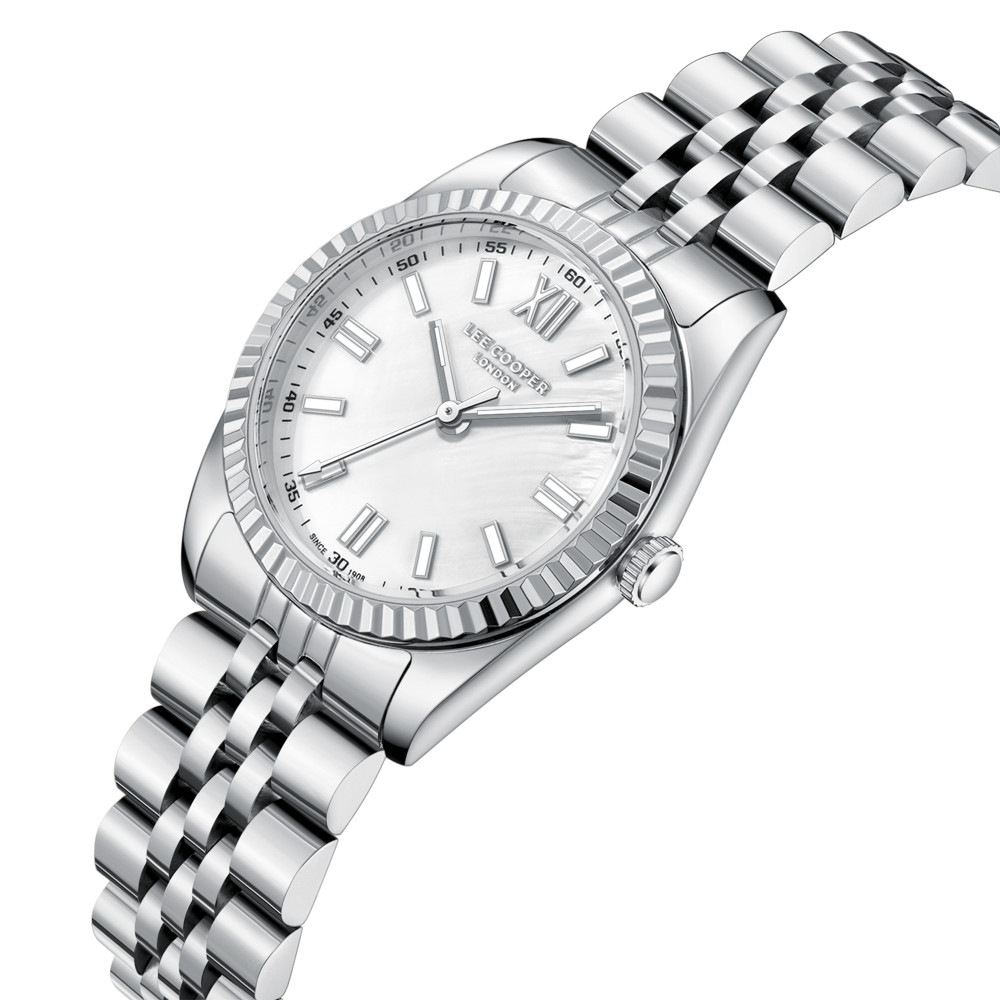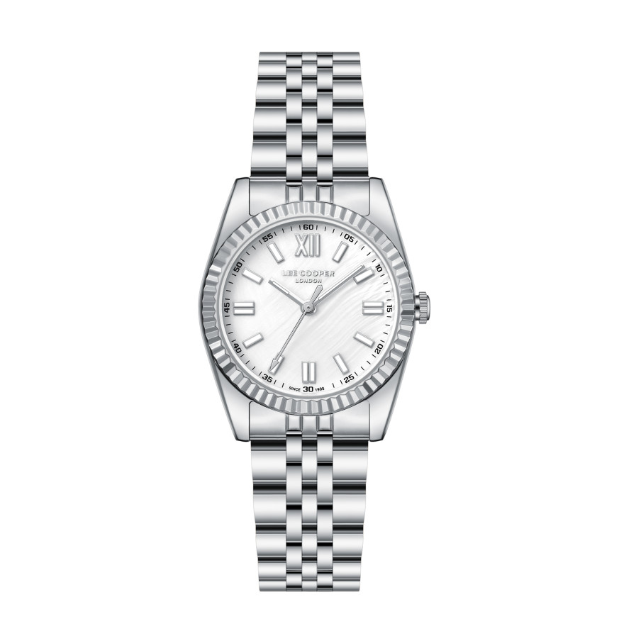 Класически модел дамски часовник Lee Cooper от колекцията Elegance. Корпус изработен от супер метал (специална сплав, създадена от Lee Cooper). Верижка от неръждаема стомана. Аналогов дисплей в нежен седефен цвят. Диаметър на корпуса 30 мм. Стъкло минерал-кристал. Часовникът се задвижва от кварцов механизъм. Водоустойчивост 3 ATM - допускат се леки пръски, не се препоръчва обилно мокрене.