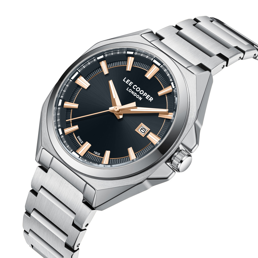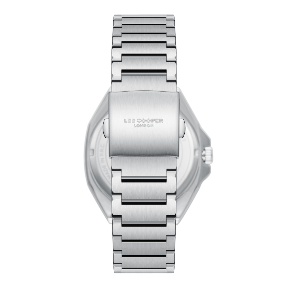 Спортно-елегантен мъжки часовник Lee Cooper от колекцията Classic Sporty. Аналогов дисплей с показател за дата. Стъкло минерал-кристал. Корпус изработен от супер метал (специална сплав, създадена от Lee Cooper). Верижка от неръждаема стомана. Кварцов механизъм. Диаметър на корпуса 42 мм. Водоустойчивост 5 ATM - допускат се леки пръски и взимане на душ, не се препоръчва обилно мокрене.
