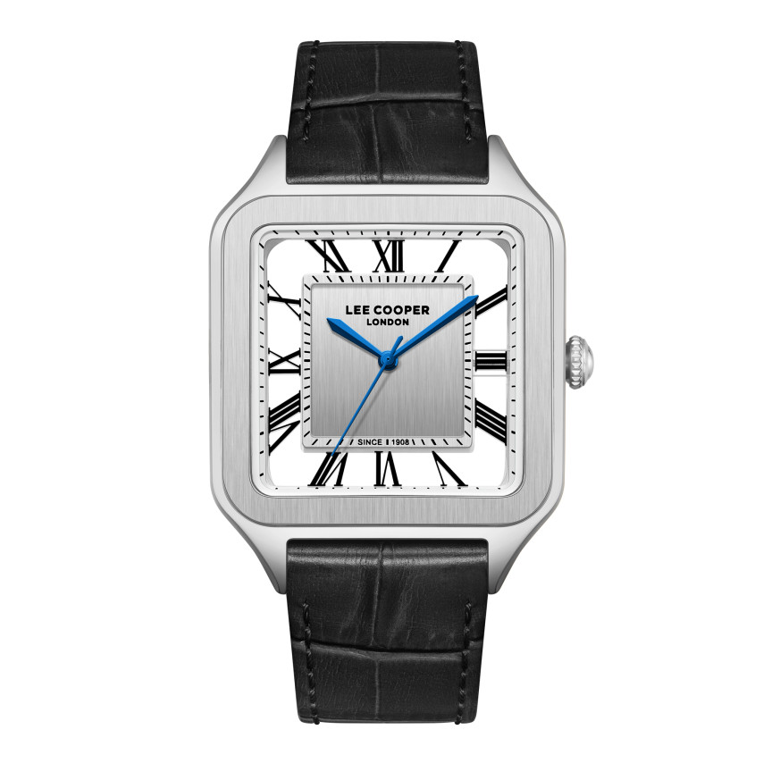 Стилен мъжки часовник Lee Cooper от колекцията Classic. Аналогов дисплей в сребрист цвят със сини стрелки и черни римски цифри. Стъкло минерал-кристал. Корпус изработен от супер метал (специална сплав, създадена от Lee Cooper). Черна каишка от естествена кожа. Часовникът се задвижва от кварцов механизъм. Водоустойчивост 3 ATM - допускат се леки пръски, не се препоръчва обилно мокрене.