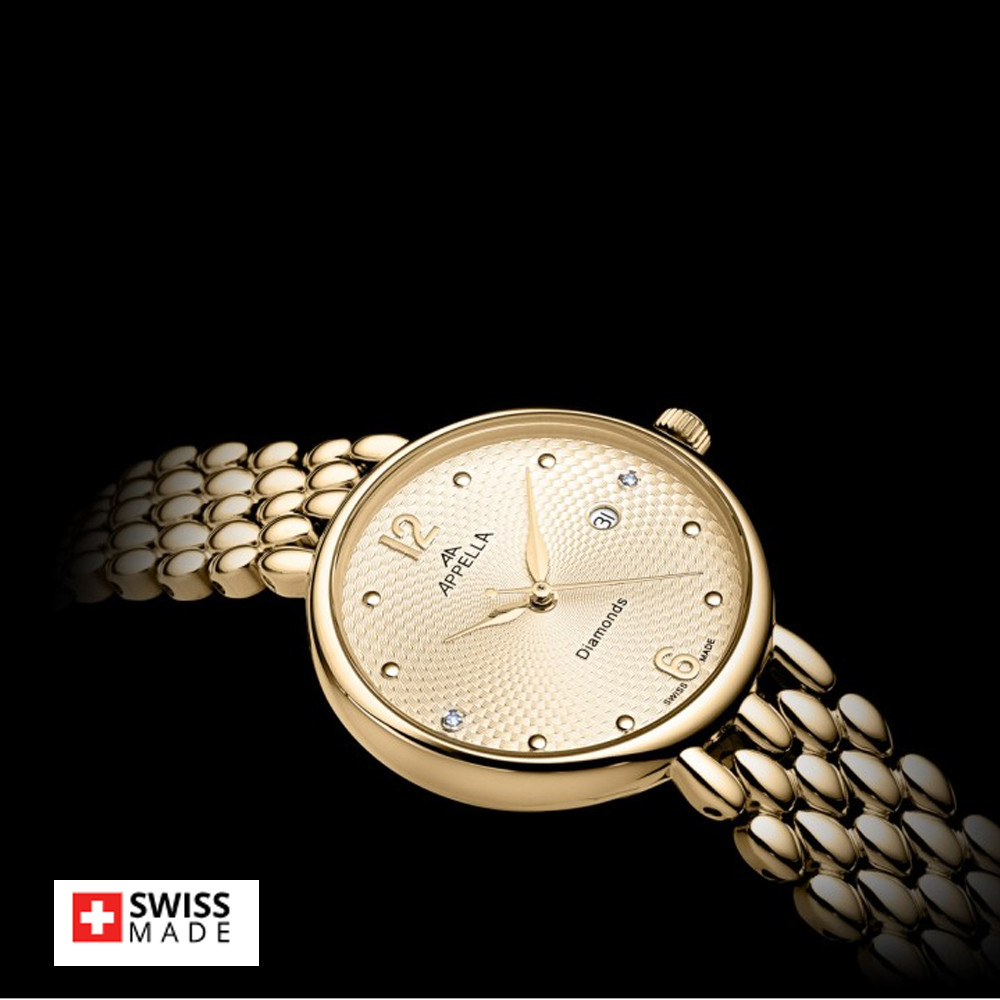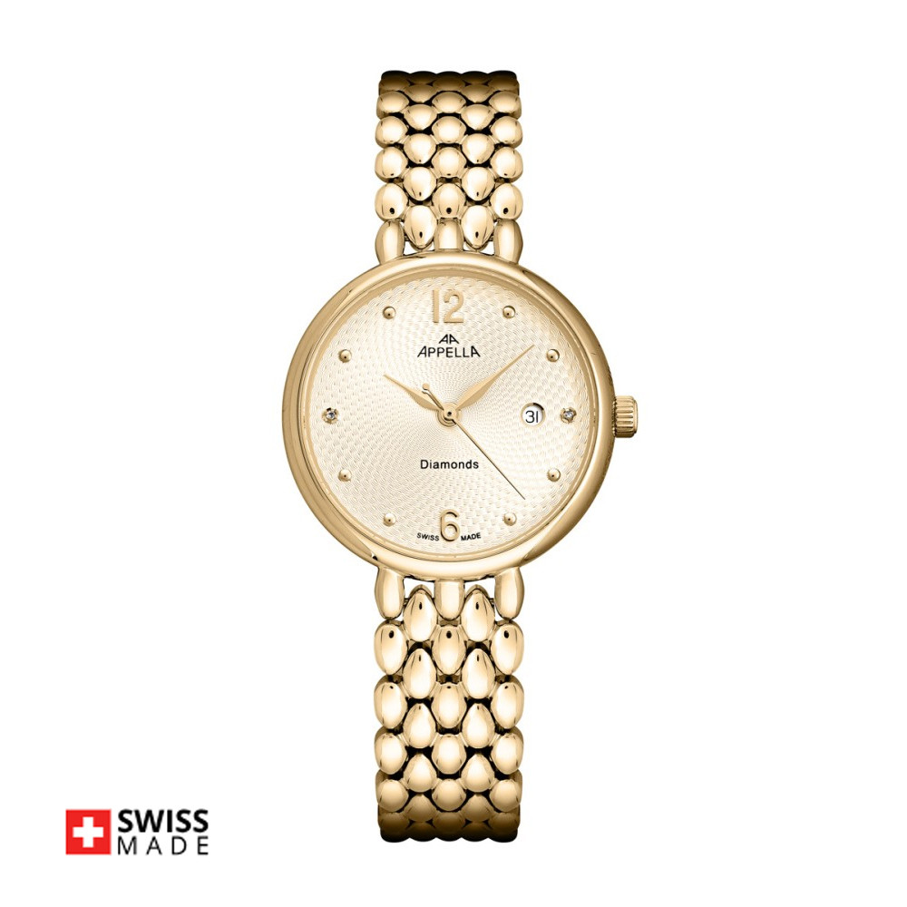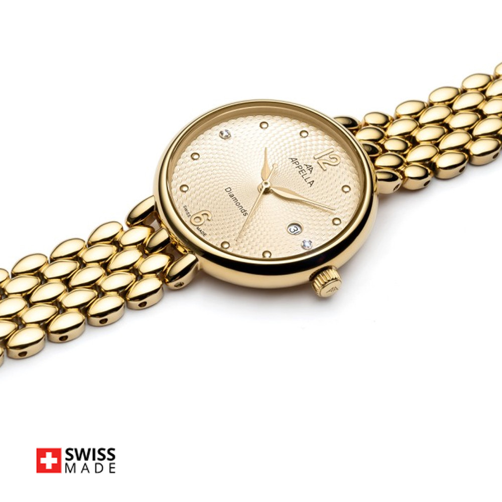 Дамски часовник Appella L50014.1171DQ с елегантна визия. Златистият корпус от неръждаема стомана е широк 31мм, което прави часовника фин, но отличителен. Златистият циферблат, декориран с два диаманта и допълнен с показател за дата, се слива перфектно с цялостния дизайн. Стъклото е сапфир-кристал с антирефлексно покритие. Верижката също е изработена от неръждаема стомана в златист цвят. Задвижва се от кварцов механизъм ETA F04 Swiss Made. Водоустойчивост 3 ATM - допускат се леки пръски, не се препоръчва обилно мокрене.