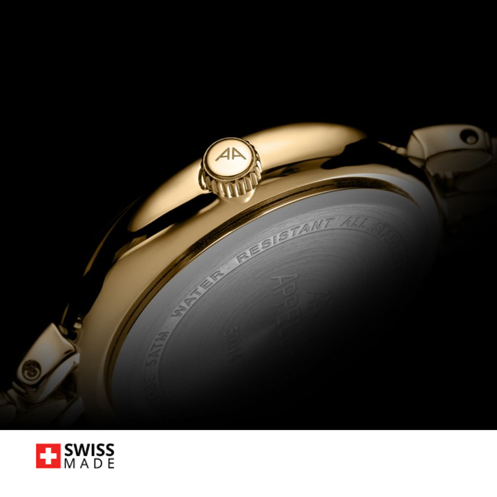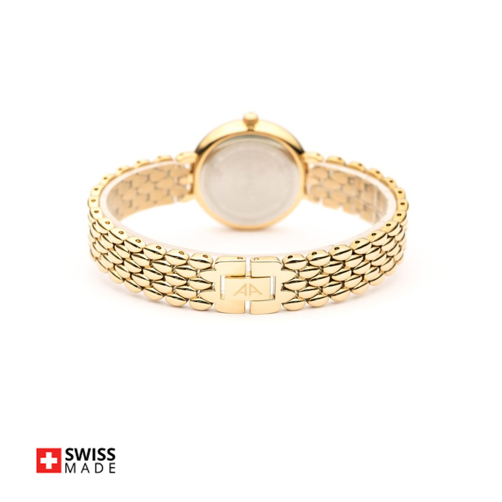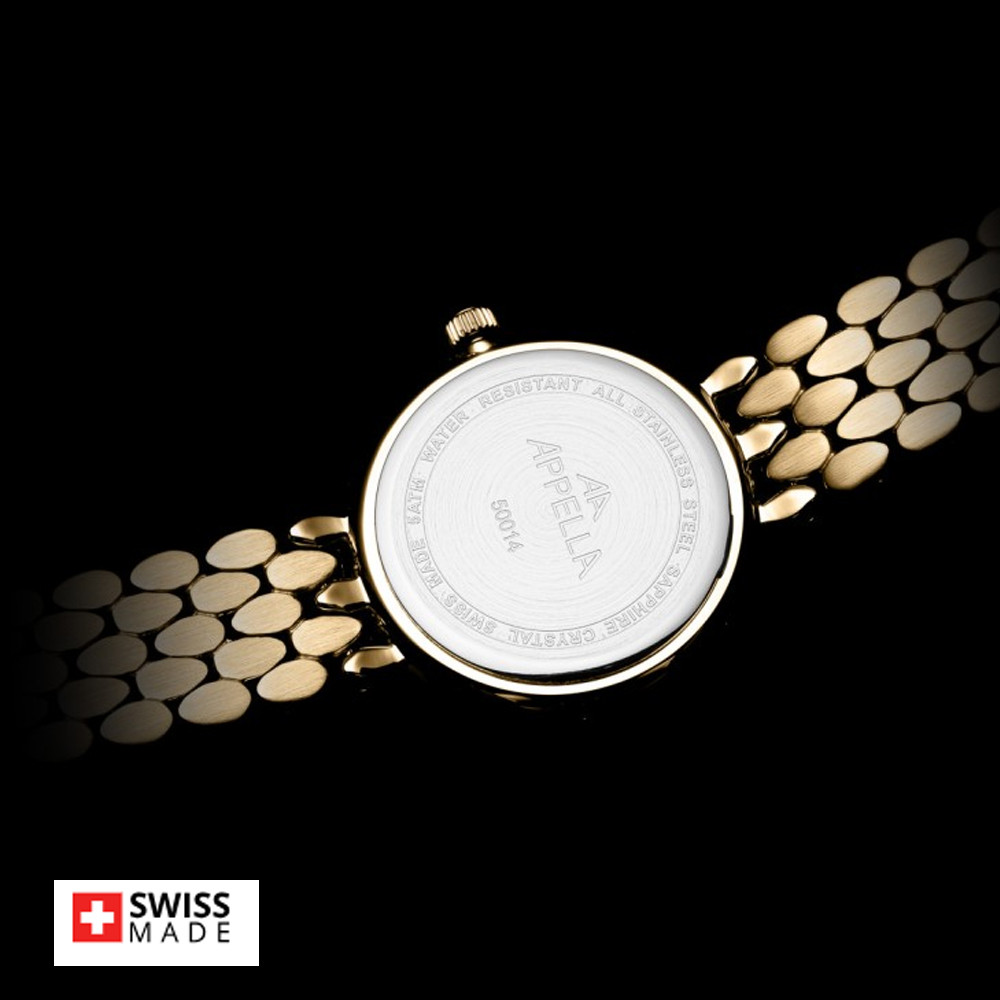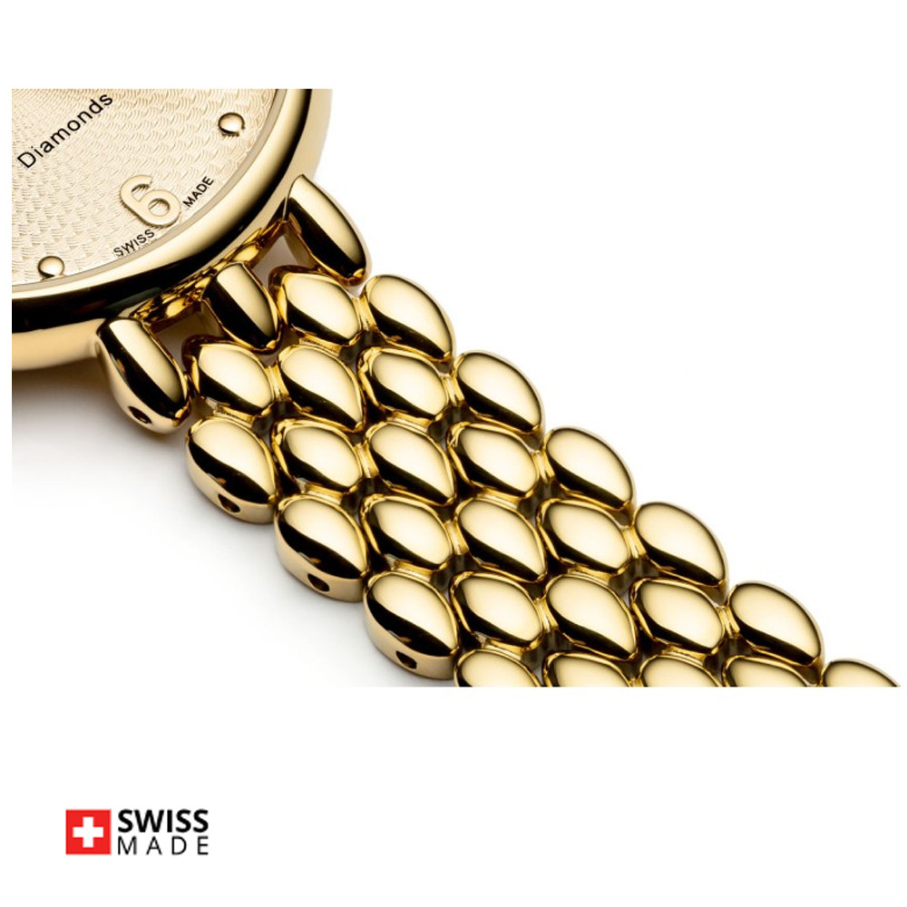 Дамски часовник Appella L50014.1171DQ с елегантна визия. Златистият корпус от неръждаема стомана е широк 31мм, което прави часовника фин, но отличителен. Златистият циферблат, декориран с два диаманта и допълнен с показател за дата, се слива перфектно с цялостния дизайн. Стъклото е сапфир-кристал с антирефлексно покритие. Верижката също е изработена от неръждаема стомана в златист цвят. Задвижва се от кварцов механизъм ETA F04 Swiss Made. Водоустойчивост 3 ATM - допускат се леки пръски, не се препоръчва обилно мокрене.