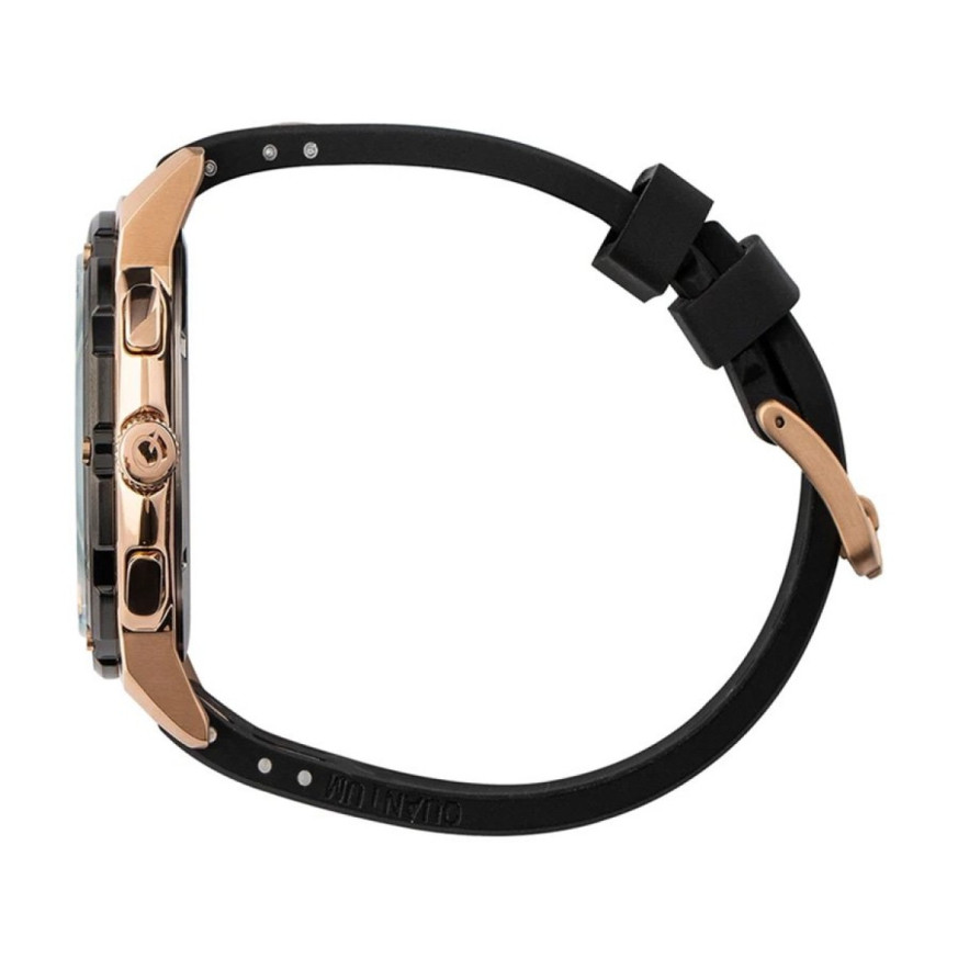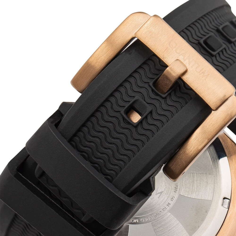 Мъжки часовник Quantum със спортно-елегантен дизайн от колекцията Powertech. Черен дисплей хронограф с детайли в цвят розово злато. Луминесцентно покритие върху стрелките и индексите. Стъкло минерал-кристал с антирефлексно покритие. Корпус от неръждаема стомана. Черна силиконова каишка. Часовникът се задвижва от кварцов механизъм с калибър VR32B15. Водоустойчивост 10 ATM - позволява мокрене, къпане и плуване във водни басейни.