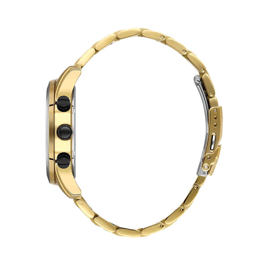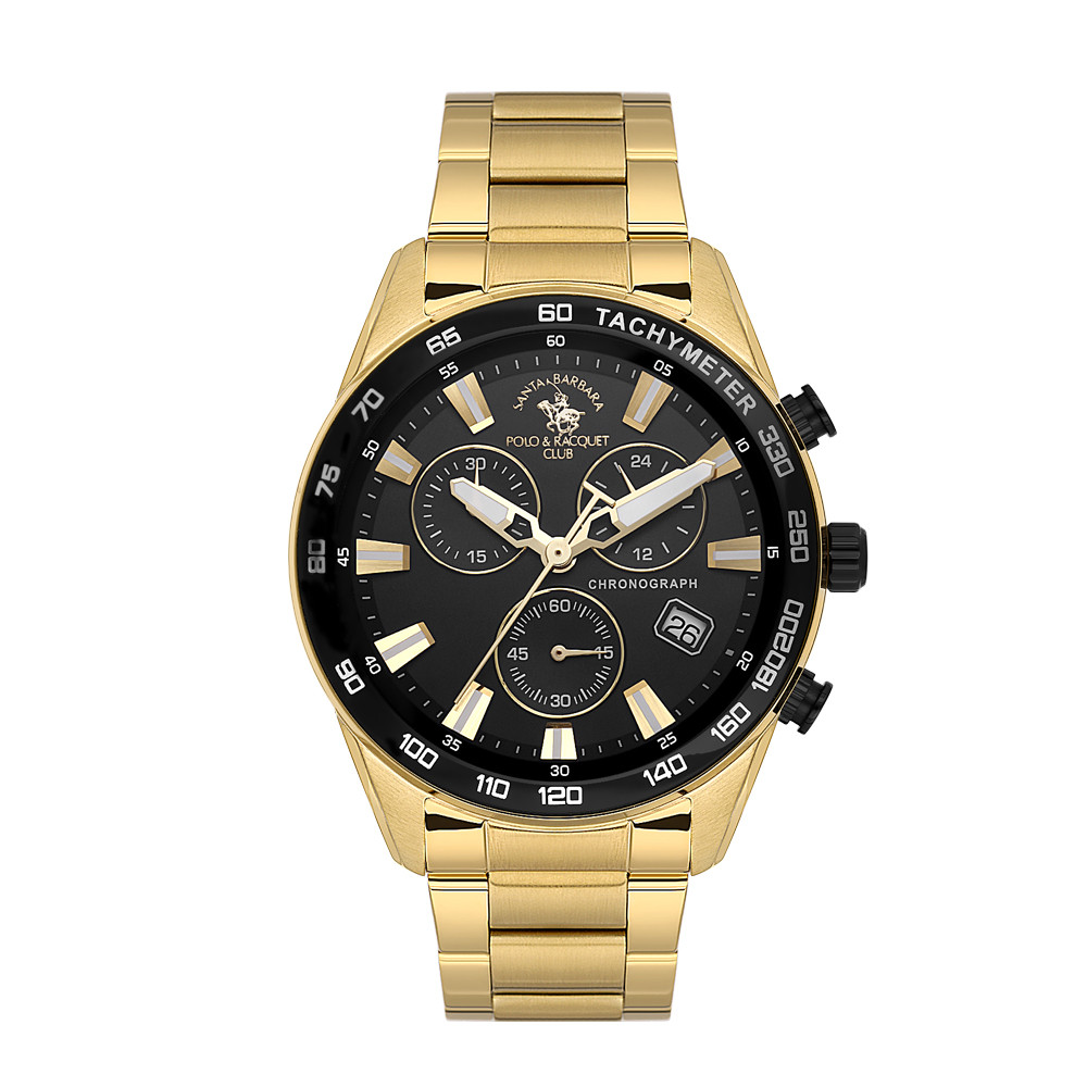 Мъжки часовник с модерен спортно-елегантен дизайн. Дисплей тип хронограф в черен цвят със златисти детайли. Луминисцентно покритие върху стрелките и индексите. Стъкло минерал-кристал. Корпус и верижка изработени от неръждаема стомана. Диаметър на корпуса 45 мм. Моделът се задвижва от кварцов механизъм. Водоустойчивост 5 ATM - допускат се леки пръски и взимане на душ, не се препоръчва обилно мокрене.