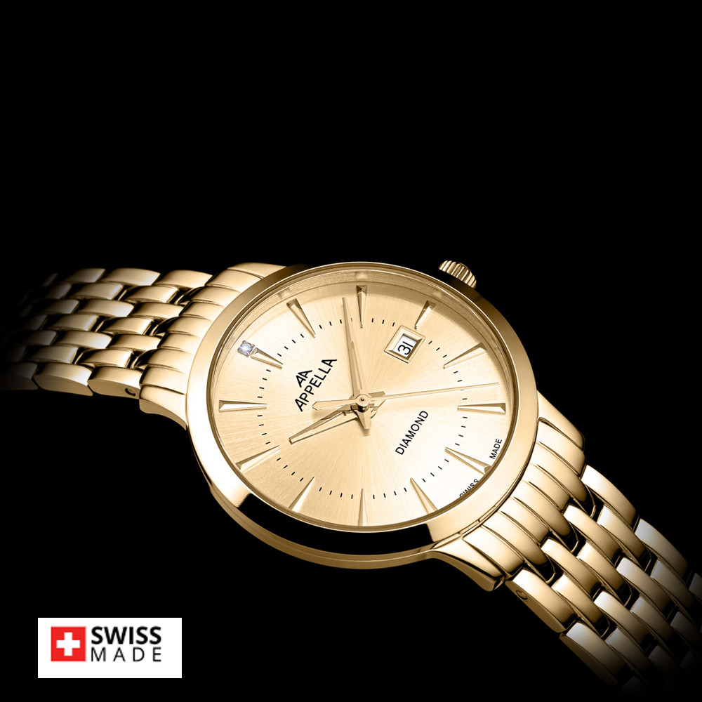 Елегантен дамски часовник Appella L32003.1191DQ. Моделът е със златист циферблат, украсен с нежен диамант и допълнен с индикатор за дата. Корпусът и верижката са изработени от неръждаема стомана. Стъклото е сапфир-кристал. Задвижва се от кварцов механизъм ETA F04/ RONDA 785 Swiss Made. Диаметър на корпуса 31 мм. Водоустойчивост 3 ATM - допускат се леки пръски, не се препоръчва обилно мокрене.