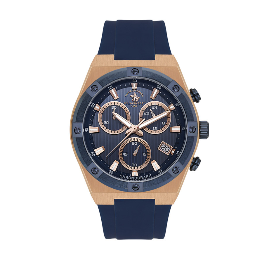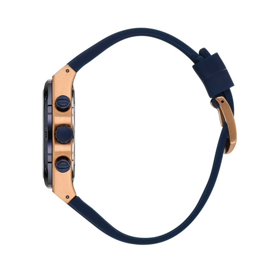 Мъжки часовник с модерен спортен дизайн от колекцията Legend. Корпус от неръждаема стомана в комбинация със силиконова каишка. Тъмносин дисплей хронограф с детайли в цвят розово злато и луминисцентно покритие върху стрелките и индексите. Диаметър на корпуса 44 мм. Стъкло минерал-кристал. Задвижва се от кварцов механизъм VR34B14. Водоустойчивост 5 ATM - допускат се леки пръски и взимане на душ, не се препоръчва обилно мокрене.