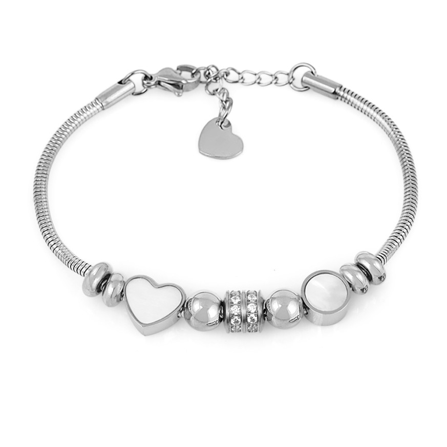 Дамска гривна на марката Daniel Klein с модерен дизайн. Изработена от неръждаема стомана с интересни декоративни елементи и декорация от нежен седеф и кристали.