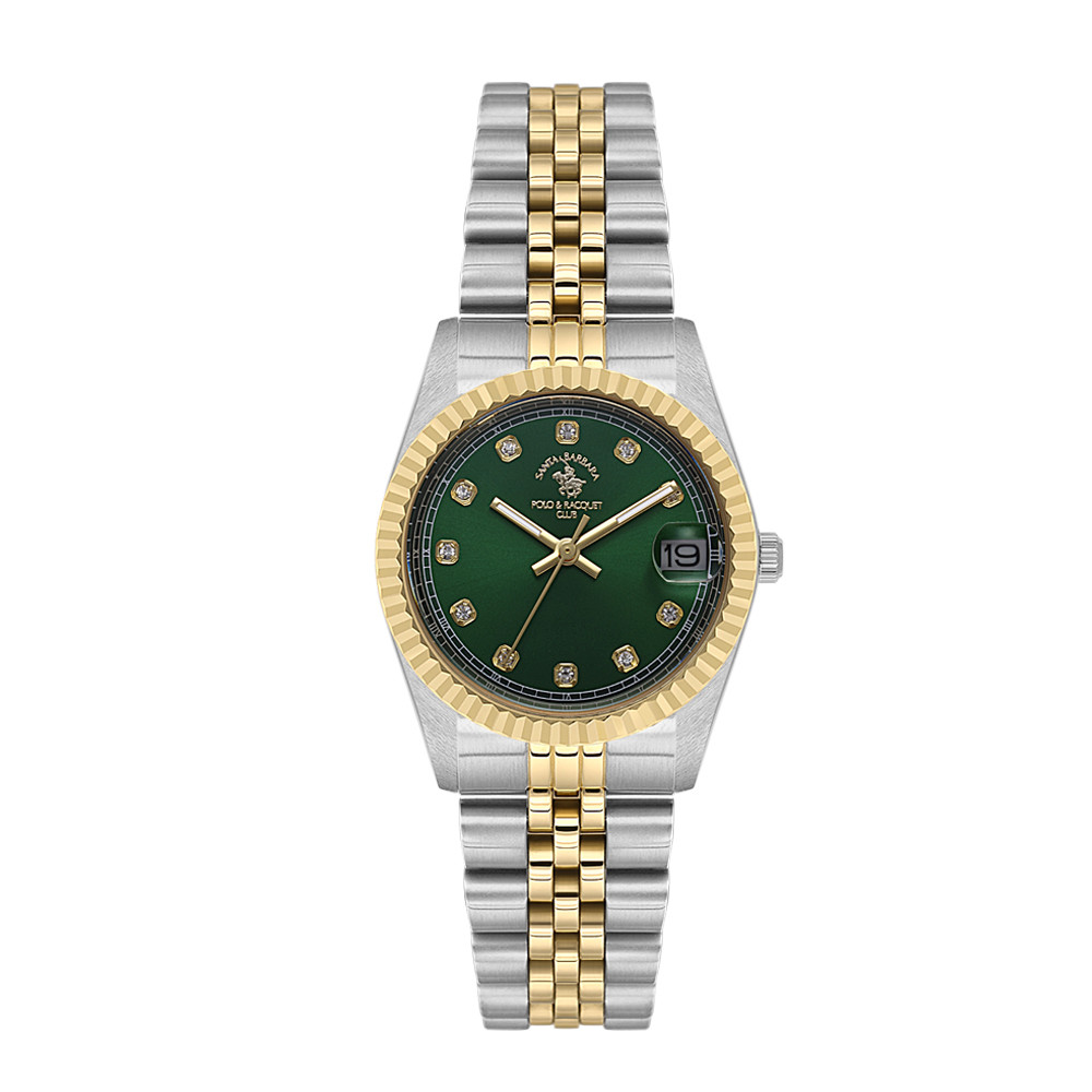Дамски часовник с класическа визия от колекцията Unique. Корпус и верижка изработени от неръждаема стомана. Аналогов дисплей в зелен цвят с показател за дата и декорация от нежни кристали по часовите маркери. Стъкло минерал-кристал. Диаметър на корпуса 31 мм. Часовникът се задвижва от кварцов механизъм. Водоустойчивост 3 ATM - допускат се леки пръски, не се препоръчва обилно мокрене.