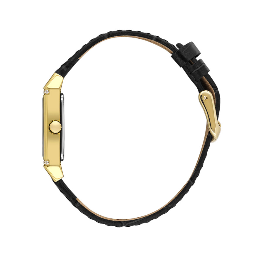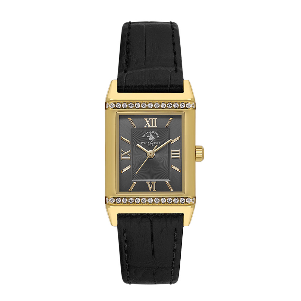 Стилен дамски часовник с класическа визия от колекцията Unique. Моделът е с декорация от нежни кристали по безела. Аналогов дисплей в черен цвят със златисти акценти. Стъкло минерал-кристал. Корпус от неръждаема стомана в комбинация с каишка от естествена кожа. Часовникът се задвижва от кварцов механизъм. Водоустойчивост 5 ATM - допускат се леки пръски и взимане на душ, не се препоръчва обилно мокрене.