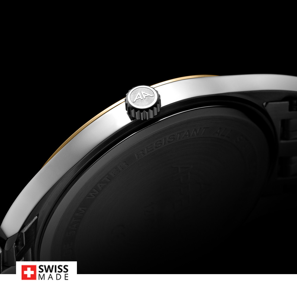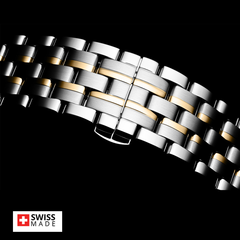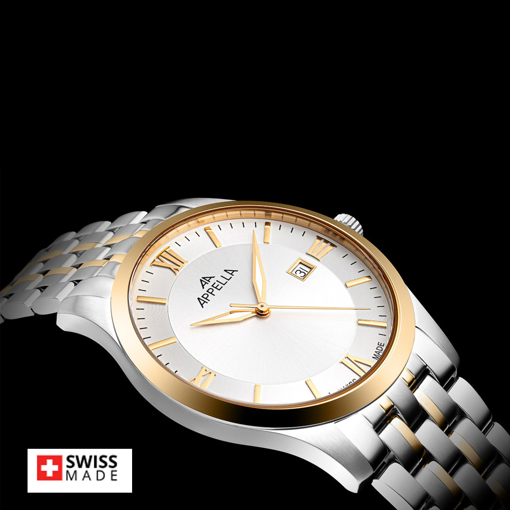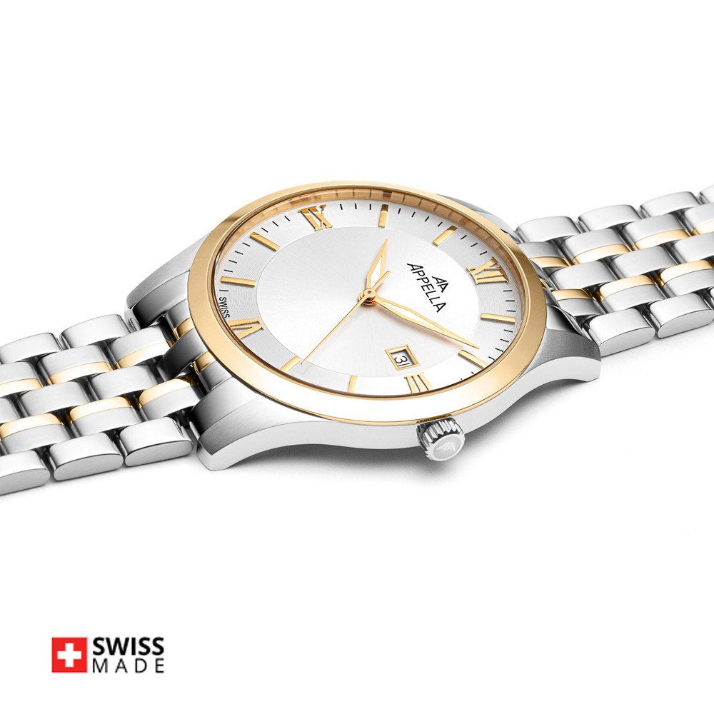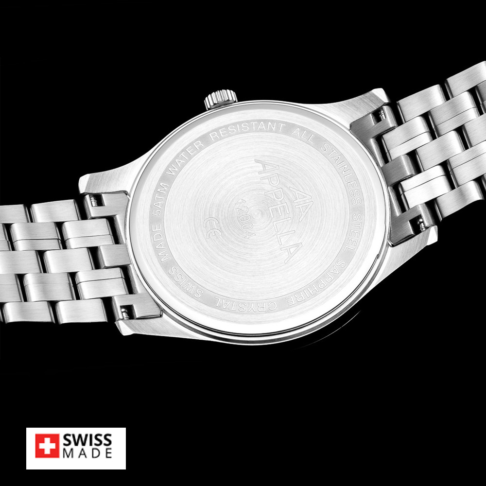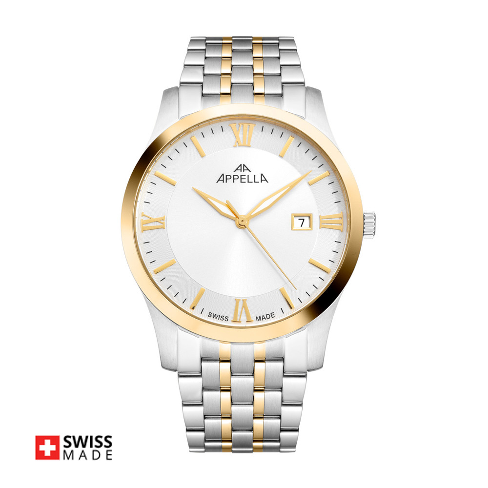 Стилен мъжки часовник Appella L12004.1167Q с корпус и верижка от неръждаема стомана. Сребрист циферблат със златисти детайли и показател за дата. Стрелките са с луминисцентно покритие. Стъклото е  сапфир-кристал. Часовникът се задвижва от кварцов механизъм ETA F06 Swiss Made. Диаметър на корпуса 42 мм. Водоустойчивост 5 ATM - допускат се леки пръски и взимане на душ, не се препоръчва обилно мокрене.