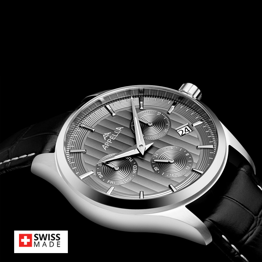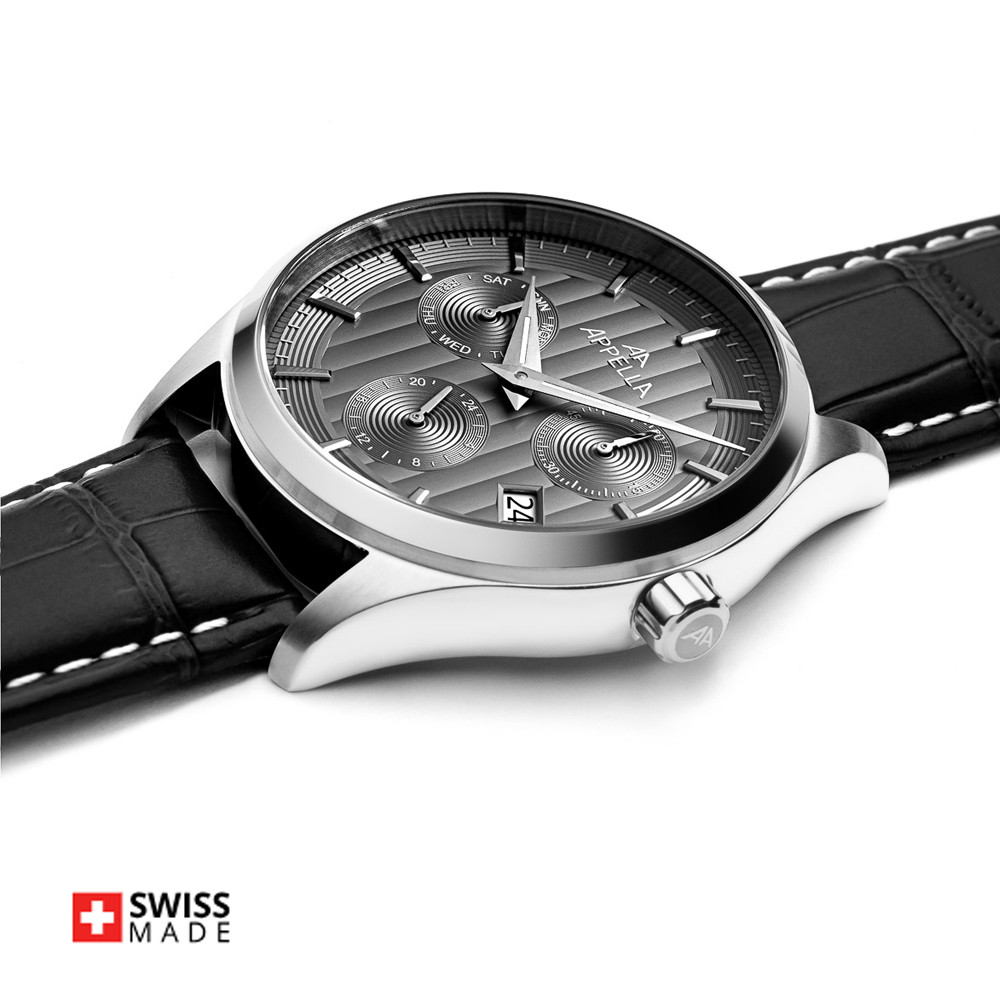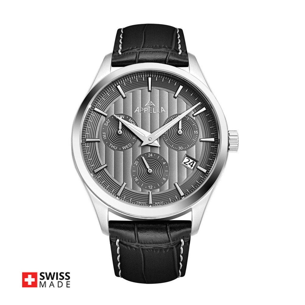 Мъжки часовник Appella L70003.5217QF с модерен дизайн. Сив мултифункционален дисплей със сребристи детайли. Корпус изработен от неръждаема стомана. Черна каишка от естествена кожа. Стъкло сапфир-кристал. Задвижва се от кварцов механизъм RONDA X30 Swiss Made. Диаметър на корпуса 43 мм. Водоустойчивост 5 ATM - допускат се леки пръски и взимане на душ, не се препоръчва обилно мокрене.