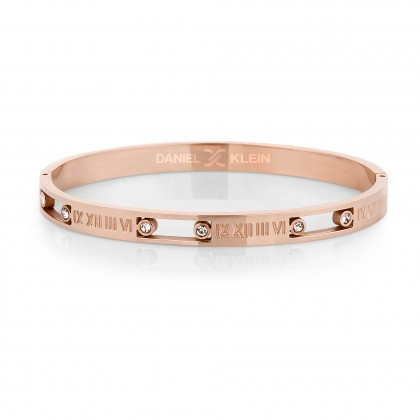 Дамска гривна с инкрустирани кристали и декорация римски цифри. Изработена от неръждаема стомана в розово-златист цвят.