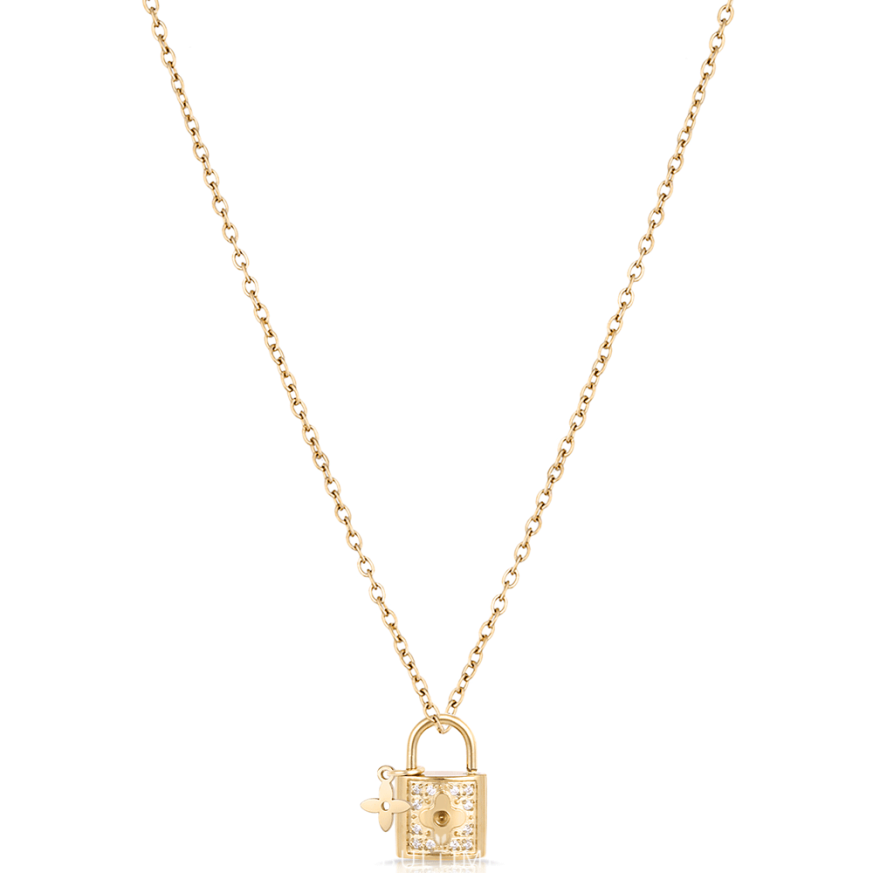 Дамско колие Daniel Klein с висулка във формата на катинар и инкрустирани нежни кристали. Моделът е изработен от неръждаема стомана.