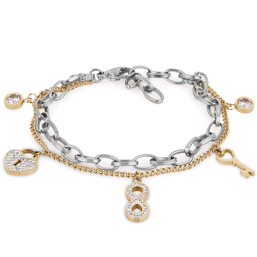 Стилна дамска гривна Daniel Klein изработена от неръждаема стомана с нежни висулки в златист цвят, допълнени от бляскави кристали. Регулируем модел.