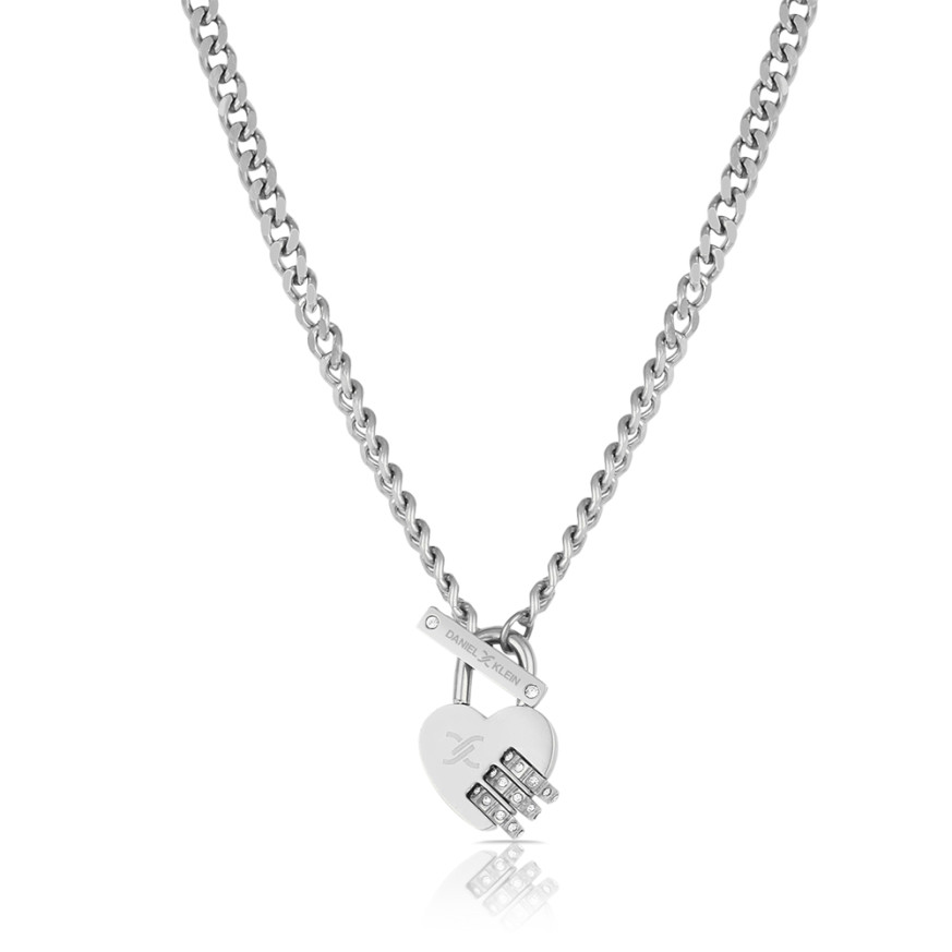 Дамско колие Daniel Klein в сребрист цвят с висулка във формата на сърце с инкрустирани кристали. Изработено от неръждаема стомана.