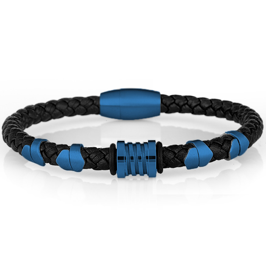 Плетен модел мъжка гривна изработена от естествена кожа с декоративни елементи и закопчалка от неръждаема стомана.