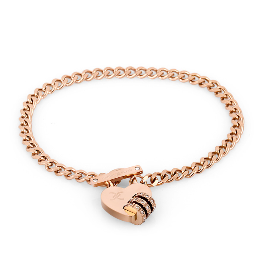 Дамска гривна в цвят розово злато, изработена от неръждаема стомана с висулка във формата на сърце с инкрустирани кристали.