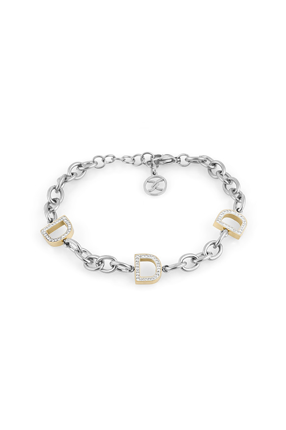 Дамска гривна Daniel Klein, изработена от неръждаема стомана. Моделът е с декоративни елементи с буквата D, които са инкрустирани с нежни кристали.