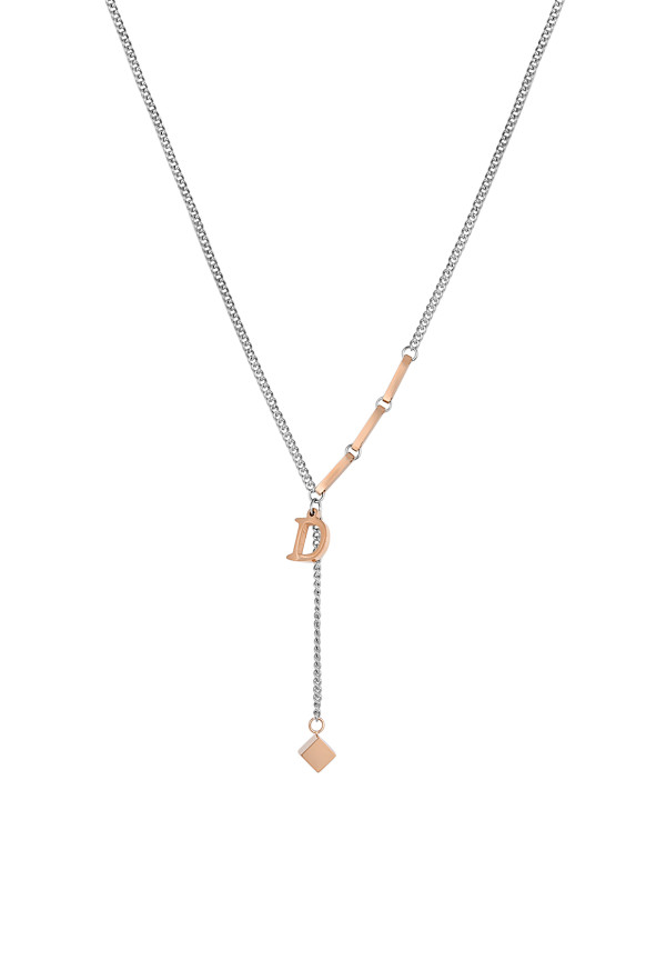 Дамско колие Daniel Klein с изчистен дизайн. Моделът е с декоративен елемент буквата "D" и кубче. Изработено е от неръждаема стомана.