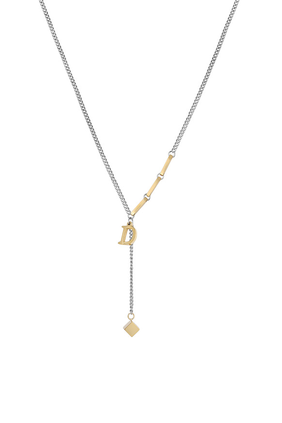 Дамско колие Daniel Klein с изчистен дизайн. Моделът е с декоративен елемент буквата "D" и кубче. Изработено е от неръждаема стомана.