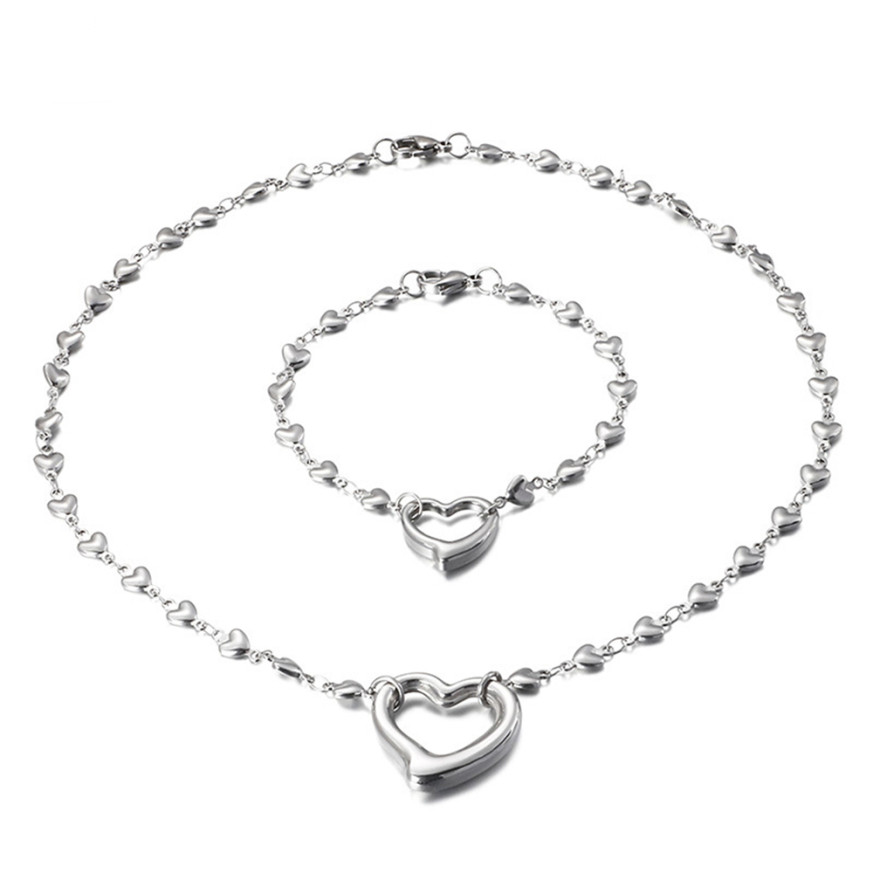 Комплект дамско колие и гривна, изработени от неръждаема стомана с декоративни елементи във формата на сърце.