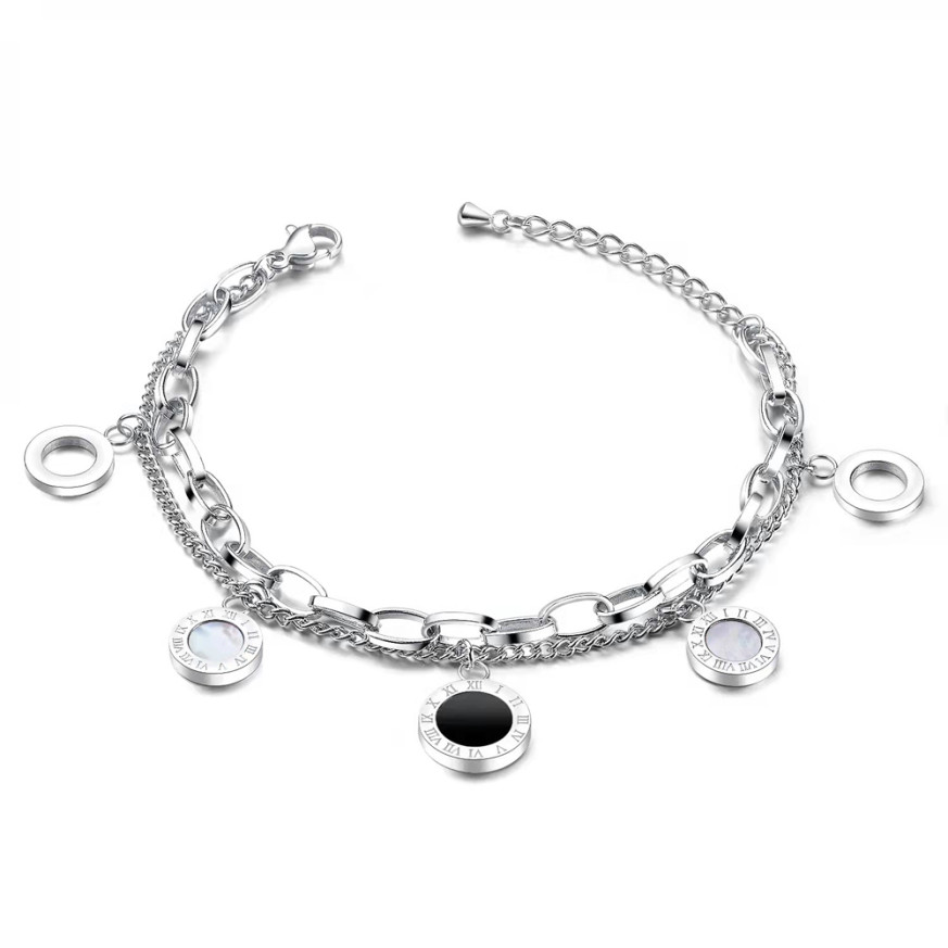Дамска гривна със стилни висулки и декорация от седеф. Изработена от неръждаема стомана в сребрист цвят. Дължина на гривната 170 мм + 30 мм.
