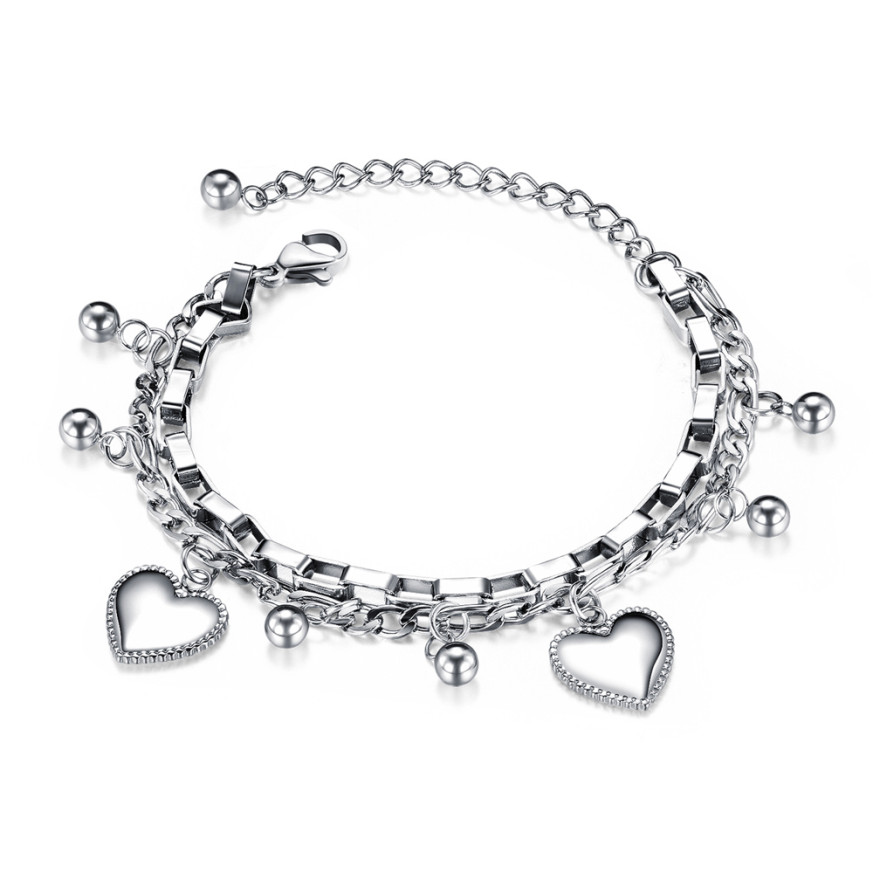 Страхотен модел дамска гривна с висящи декоративни елементи. Изработена от неръждаема стомана. Дължина на гривната 165 мм + 55 мм.