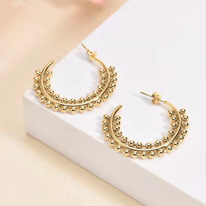Дамски обеци халки с впечатляващ дизайн и отличителни декоративни елементи. Моделът е изработен от неръждаема стомана.