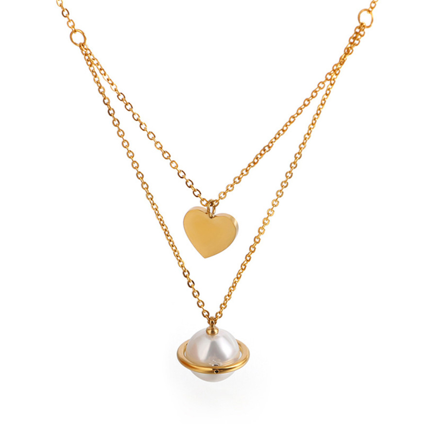 Дамско двойно колие с висулка наподобяваща перла и сърце. Моделът е изработен от неръждаема стомана.