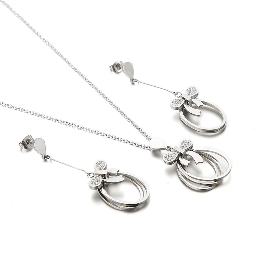 Нежен дамски комплект от колие и обеци, изработени от неръждаема стомана с декорация от кристали.