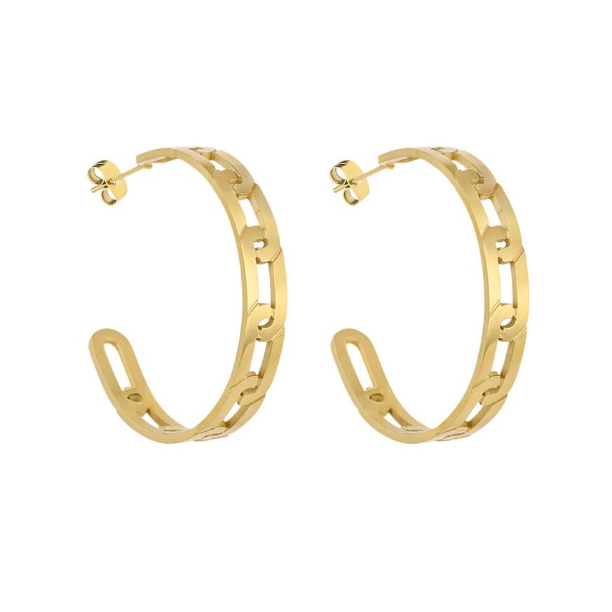 Дамски обеци тип халки с интересен дизайн. Изработени от неръждаема стомана. Моделът е със закопчаване на винт.