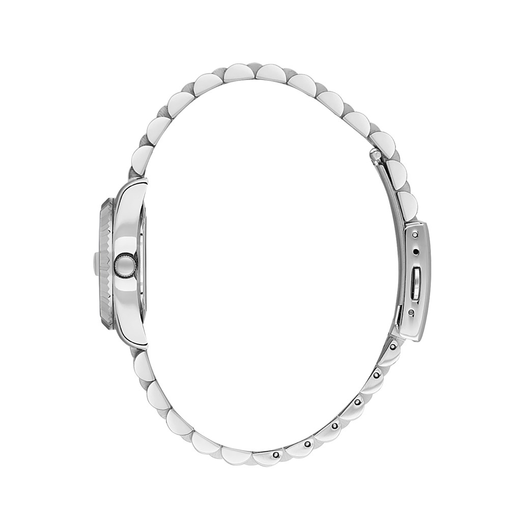 Красив дамски часовник от колекцията Unique. Моделът е с корпус и верижка от неръждаема стомана. Седефен аналогов дисплей с показател за дата и декорация от нежни кристали по часовите маркери. Диаметър на корпуса 28 мм. Стъкло минерал-кристал. Задвижва се от кварцов механизъм. Водоустойчивост 3 ATM - допускат се леки пръски, не се препоръчва обилно мокрене.