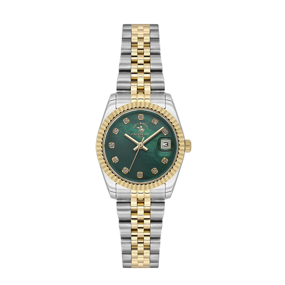 Красив дамски часовник от колекцията Unique. Моделът е с корпус и верижка от неръждаема стомана. Седефен аналогов дисплей в зелен цвят с показател за дата и декорация от нежни кристали по часовите маркери. Диаметър на корпуса 28 мм. Стъкло минерал-кристал. Задвижва се от кварцов механизъм. Водоустойчивост 3 ATM - допускат се леки пръски, не се препоръчва обилно мокрене.