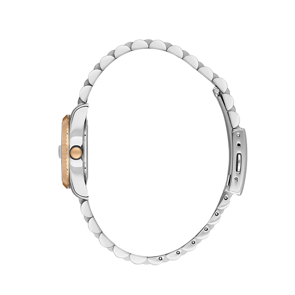 Красив дамски часовник от колекцията Unique. Моделът е с корпус и верижка от неръждаема стомана. Седефен аналогов дисплей с показател за дата и декорация от нежни кристали по часовите маркери. Диаметър на корпуса 28 мм. Стъкло минерал-кристал. Задвижва се от кварцов механизъм. Водоустойчивост 3 ATM - допускат се леки пръски, не се препоръчва обилно мокрене.
