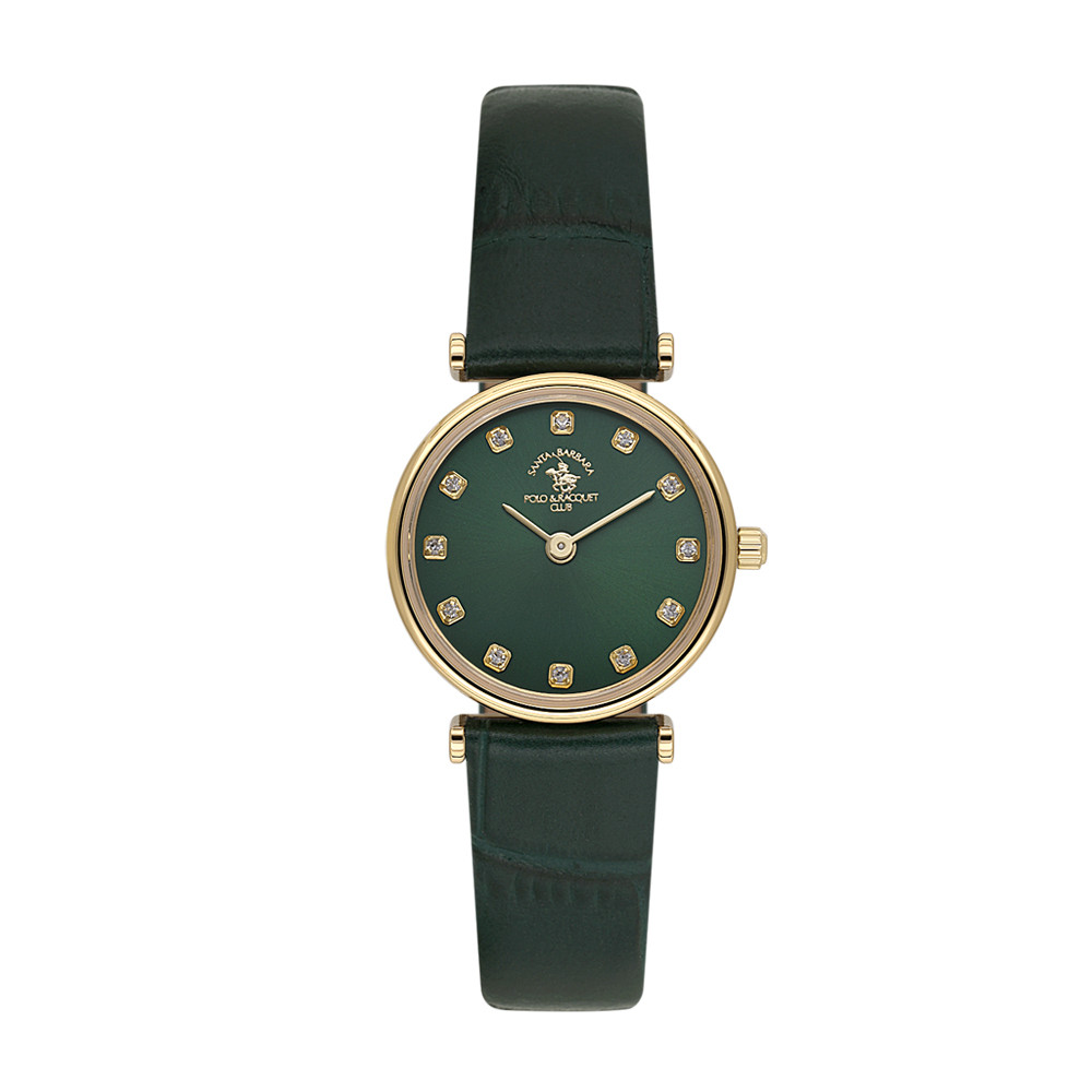 Стилен дамски часовник от колекцията Unique. Корпус от неръждаема стомана в комбинация с кожена каишка. Зелен аналгов дисплей с декорация от нежни кристали по часовите маркери. Диаметър на корпуса 24 мм. Стъкло минерал-кристал. Задвижва се от кварцов механизъм. Водоустойчивост 3 ATM - допускат се леки пръски, не се препоръчва обилно мокрене.