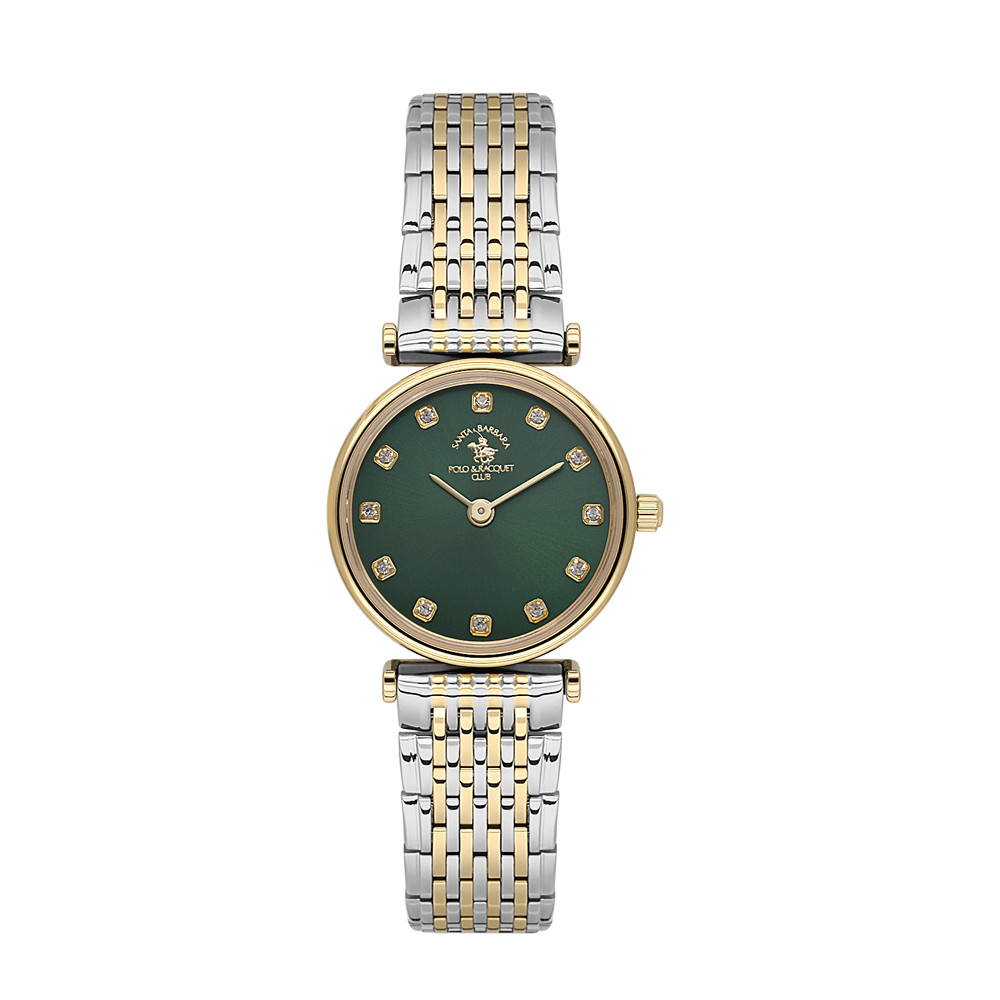 Стилен дамски часовник от колекцията Unique. Корпус и верижка изработени от неръждаема стомана. Зелен аналгов дисплей с декорация от нежни кристали по часовите маркери. Диаметър на корпуса 24 мм. Стъкло минерал-кристал. Задвижва се от кварцов механизъм. Водоустойчивост 3 ATM - допускат се леки пръски, не се препоръчва обилно мокрене.