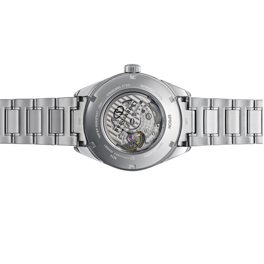 Часовник Orient Star RE-BY0010L от колекцията M-Collection /M34 F7/ съчетава класическа елегантност и модерна механика. Тъмносиният циферблат е подчертан от полускелетен отвор, който разкрива част от механизма, индикатор за резерв на мощността и отделен секундарник за допълнителна функционалност. Корпусът и верижката са изработени от неръждаема стомана, а сапфир-кристалът със супер антирефлексно покритие осигурява изключителна видимост. Автоматичният механизъм F7F44 с 24 камъка и 50-часов резерв на мощността гарантира прецизност и надеждност. С диаметър 40 мм и водоустойчивост до 10 ATM, този модел е подходящ както за елегантни поводи, така и за ежедневна употреба.