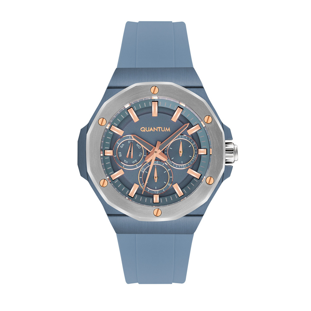 Дамски часовник Quantum с модерна спортна визия. Мултифункционален дисплей с показатели за дата, ден от седмицата и 24-часов формат. Стъкло минерал-кристал. Корпус от неръждаема стомана в комбинация със силиконова каишка. Диаметър на корпуса 38 мм. Часовникът се задвижва от кварцов механизъм. Водоустойчивост 5 ATM - допускат се леки пръски и взимане на душ, не се препоръчва обилно мокрене.
