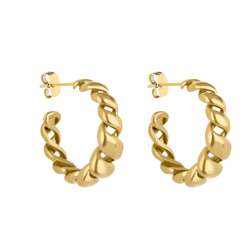 Дамски обеци тип халки с интересен дизайн. Изработени от неръждаема стомана.
