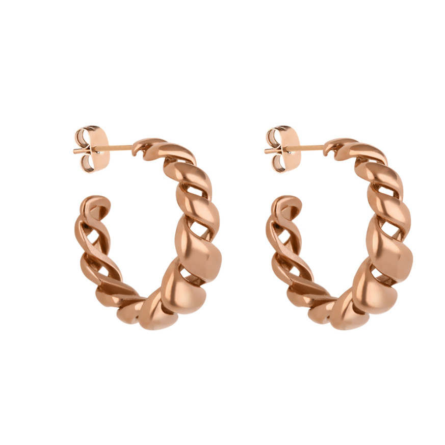Дамски обеци тип халки с интересен дизайн. Изработени от неръждаема стомана.