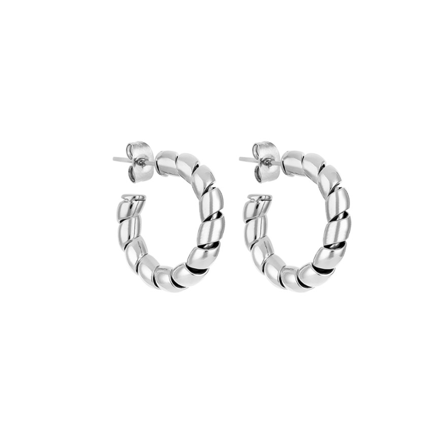 Красиви дамски обеци тип халки с впечатляващ дизайн, изработени от неръждаема стомана. Обеците са размер S.