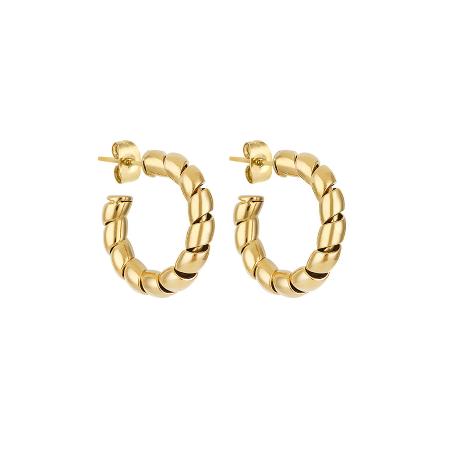 Красиви дамски обеци тип халки с впечатляващ дизайн, изработени от неръждаема стомана. Обеците са размер S.