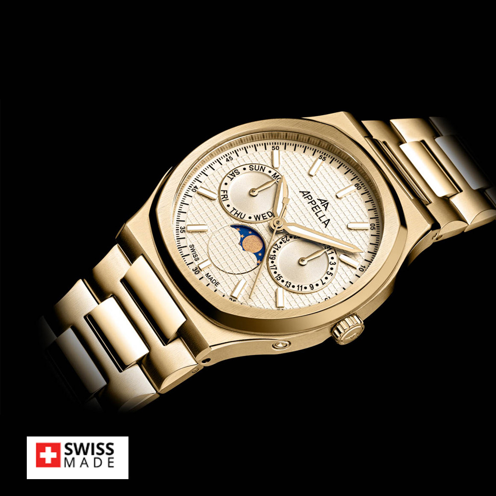 Дамски часовник Appella L32006.1111QF със спортно-елегантен дизайн. Мултифункционален дисплей с показатели за дата, ден от седмицата и лунна фаза. Луминисцентно покритие на стрелките и индексите.  Корпус и верижка изработени от неръждаема стомана. Стъкло сапфир-кристал с антирефлексно покритие. Задвижва се от кварцов механизъм RONDA 706 Swiss Made. Диаметър на корпуса 36.5 мм. Водоустойчивост 5 ATM - допускат се леки пръски и взимане на душ, не се препоръчва обилно мокрене.