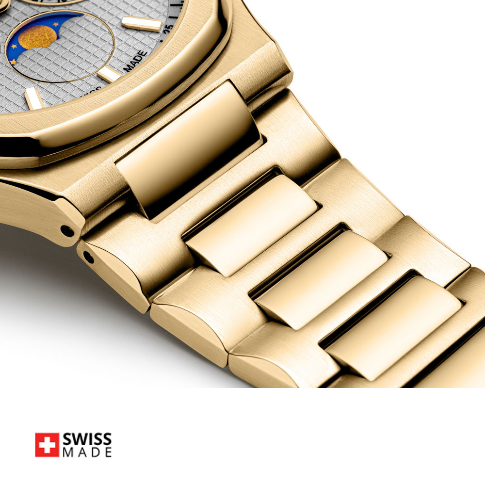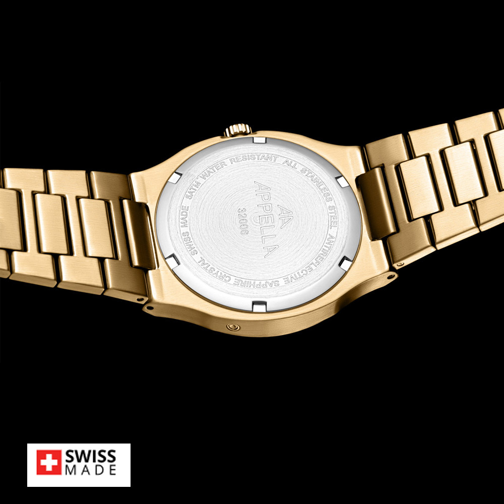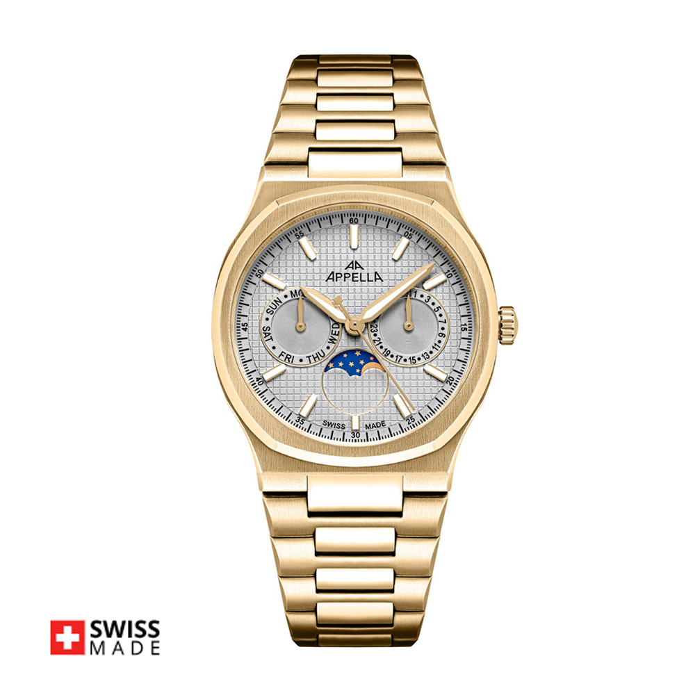 Дамски часовник Appella L32006.1117QF със спортно-елегантен дизайн. Мултифункционален дисплей с показатели за дата, ден от седмицата и лунна фаза. Луминисцентно покритие върху стрелките и индексите.  Корпус и верижка изработени от неръждаема стомана. Стъкло сапфир-кристал с антирефлексно покритие. Задвижва се от кварцов механизъм RONDA 706 Swiss Made. Диаметър на корпуса 36.5 мм. Водоустойчивост 5 ATM - допускат се леки пръски и взимане на душ, не се препоръчва обилно мокрене.