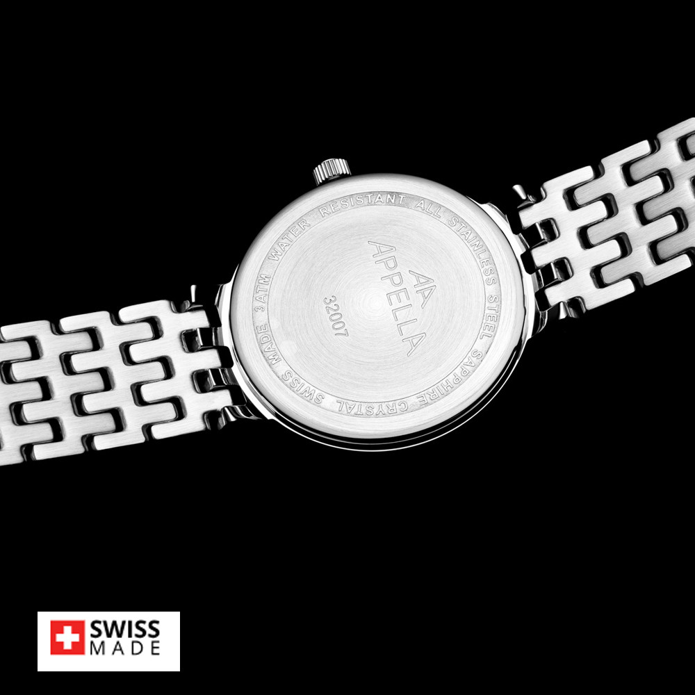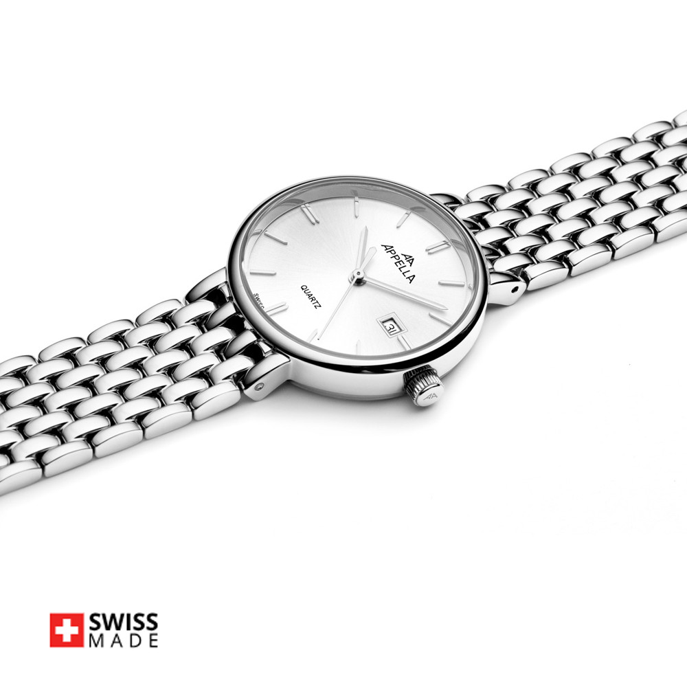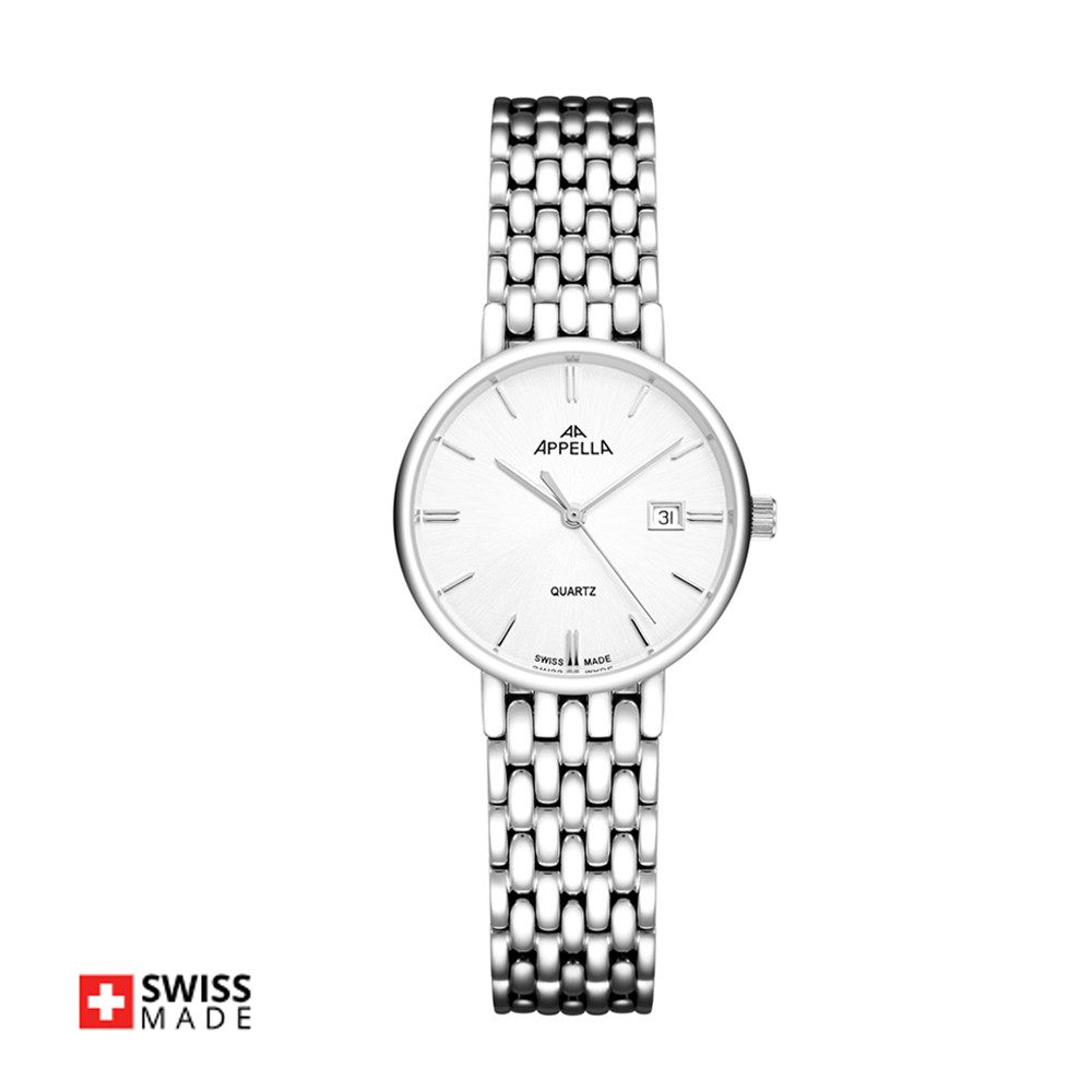 Appella L32007.5113Q е елегантен дамски часовник с корпус и верижка изработени от неръждаема стомана. Циферблат в сребрист цвят с индикатор за дата. Стъкло сапфир-кристал. Задвижва се от кварцов механизъм RONDA 785 Swiss Made. Диаметър на корпуса 30 мм. Водоустойчивост 3 ATM - допускат се леки пръски, не се препоръчва обилно мокрене.
