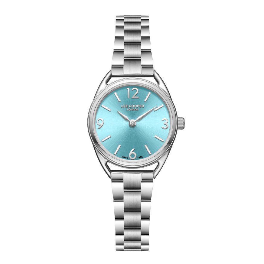 Класически модел дамски часовник Lee Cooper с красив дизайн от колекцията Elegance. Моделът е с корпус от супер метал (специална сплав, създадена от марката)  и верижка от неръждаема стомана. Дисплеят е аналогов в тюркоазен цвят със сребристи акценти. Диаметър на корпуса 26 мм. Стъклото е минерал-кристал. Часовникът се задвижва от кварцов механизъм. Водоустойчивост 3 ATM - допускат се леки пръски, не се препоръчва обилно мокрене.