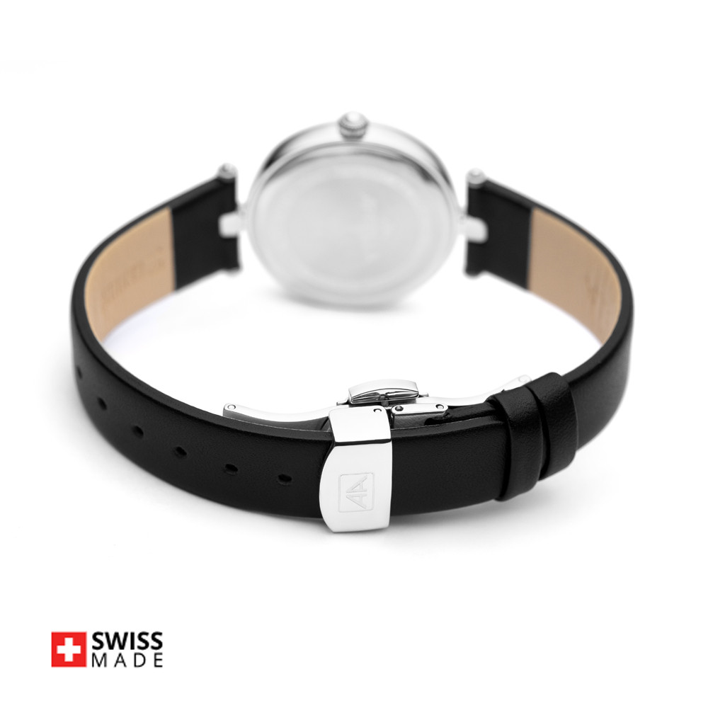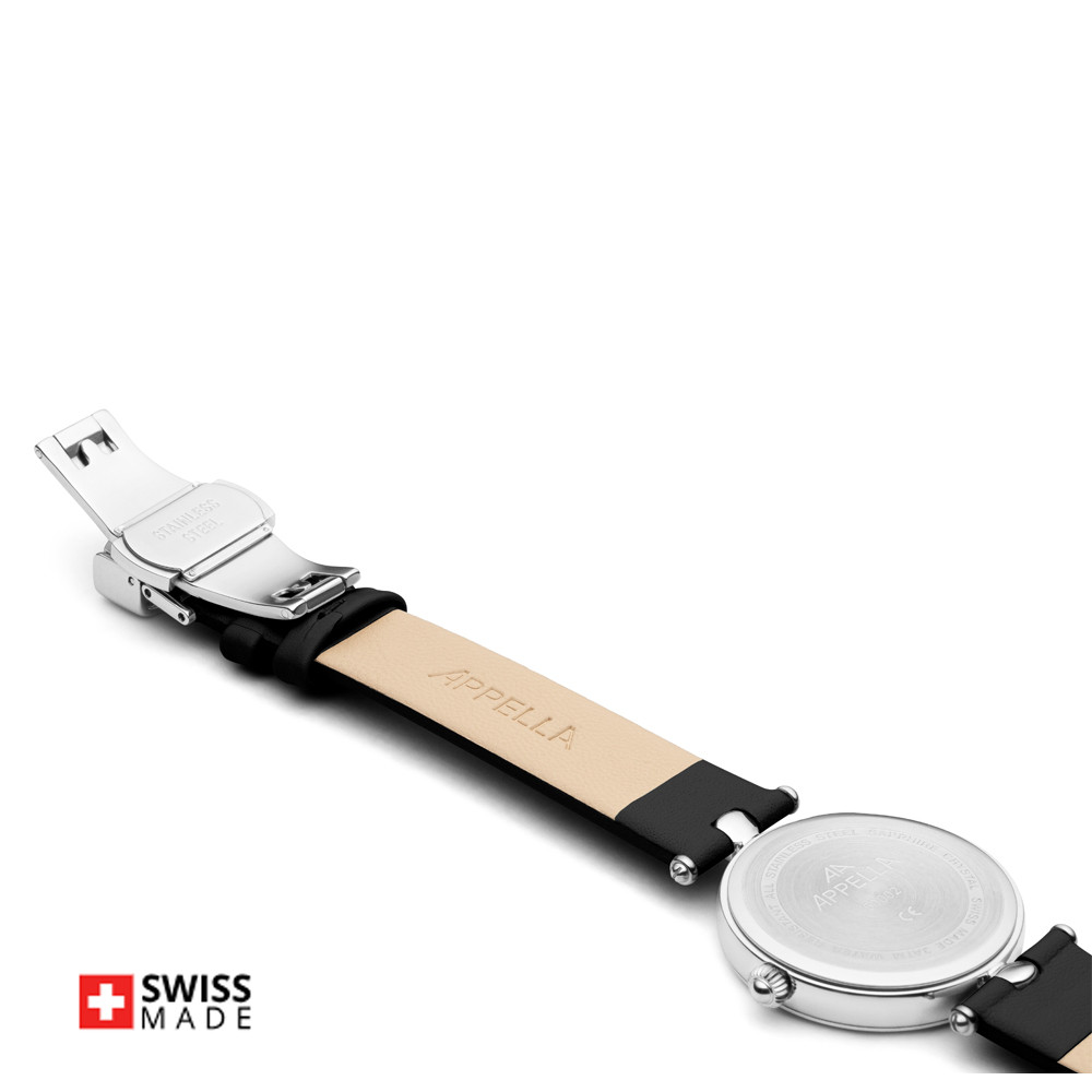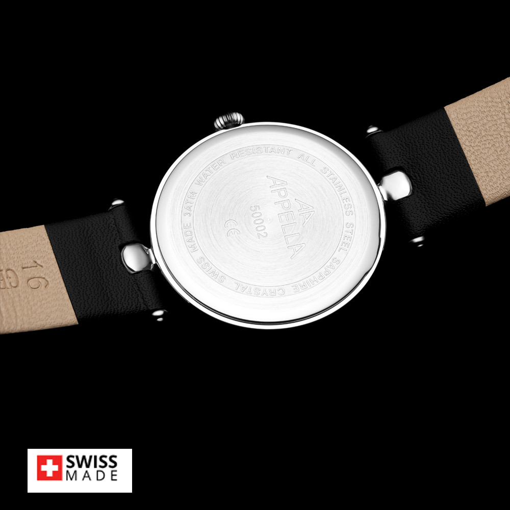 Елегантен дамски часовник Appella L50002.5247DQ с нежен дизайн. Циферблат в сив цвят, украсен с 12 диаманта и допълнен с индикатор за дата. Корпусът от неръждаема стомана. Черна каишка от естествена кожа. Стъкло сапфир-кристал. Задвижва се от кварцов механизъм ETA F04 Swiss Made. Диаметър на корпуса 31 мм. Водоустойчивост 3 ATM - допускат се леки пръски, не се препоръчва обилно мокрене.